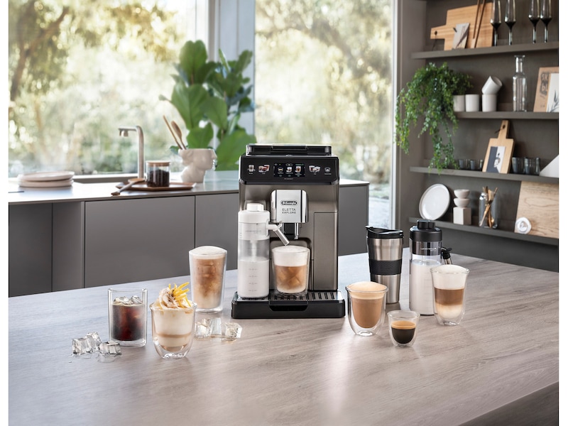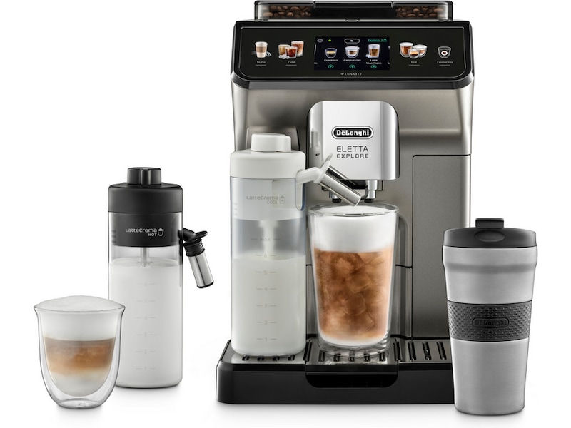 Lag mer enn 50 varme, kalde og kaldbryggede kaffedrikker, med den automatiske kaffemaskinen De'Longhi Eletta Explore med titanlakkert front. Nyt automatisk varmt melkeskum takket være LatteCrema Hot Technology* og forfriskende kalde og kaldbryggede kaffedrikker med LatteCrema Cool* og Cold Extraction Technologies. Nyt din egen kafé hjemme og på farten med To-Go-funksjonen.