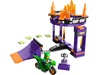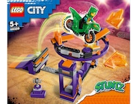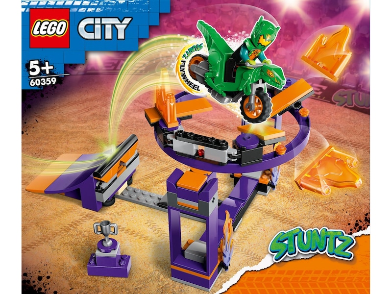 - Hva inneholder esken? Lekebyggesettet inkluderer en LEGO® City Stuntz-kurv som kan plasseres horisontalt eller vertikalt, en hopperampe, en svinghjuldrevet stuntmotorsykkel og en minifigur-kjører