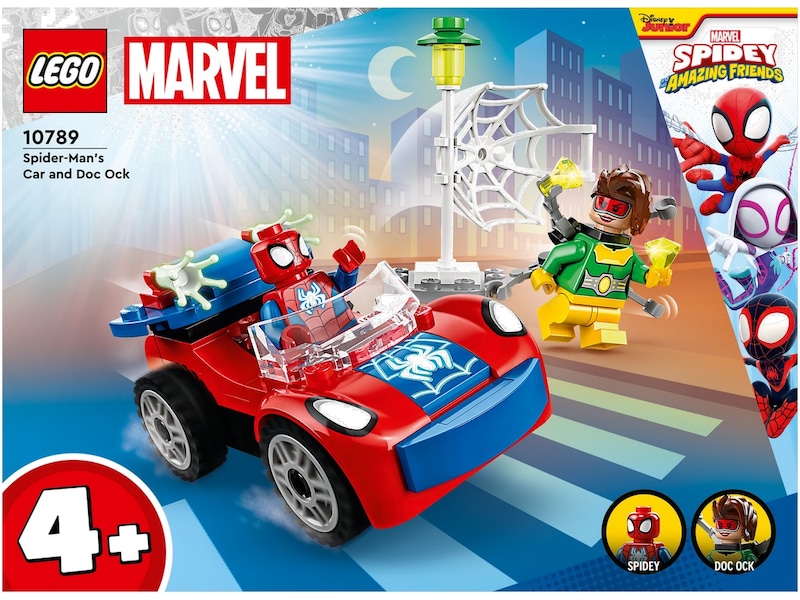 Gi små barn ekte superhelt-action med LEGO® Marvel Spider-Mans bil og Doc Ock (10789). Ikoniske figurer, et supertøft kjøretøy og kult tilbehør gjør lekesettet perfekt for barn fra fire år. Nettskytende action med Spideys bil og Doc Ock Et diamanttyveri kickstarter handlingen og gir barn utallige fantasifulle eventyr. Settet inneholder to minifigurer – Spidey og Doc Ock – samt Spideys bil og to selvlysende nett-elementer. Et spesielt startkloss-chassis inspirerer barn til å bygge Spideys bil «helt selv». Settet inkluderer enkle instruksjoner i form av en fargerik bildeveiledning og, for ekstra digital moro, får barn LEGO Builder appen med verktøy for zooming, rotering og visning av modellen mens de bygger. Gøyal lek for hele familien 4+-settene passer perfekt for voksne som ønsker å delta i gøyal bygging med barna sine, enten de er erfarne LEGO byggere eller aldri har bygget med LEGO klosser før.