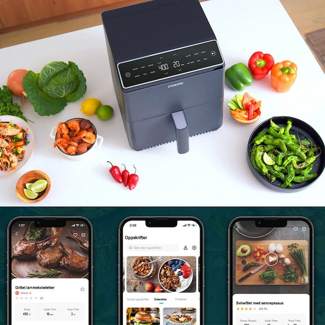 Cosori Dual Blaze Airfryer erstatter både frityrkokeren, ovnen, komfyren og mikrobølgeovnen. Ikke noe med dette, men den kan tilberede maten med opp til 90% mindre fett, uten at det går på bekostning av smaken.