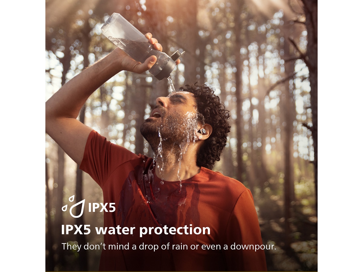 IPX5-sertifisering betyr at disse hodetelefonene tåler både regndråper og -skurer, så de vil aldri gi deg en unnskyldning for å bli værende på sofaen! Hvis du blir svett på treningssenteret, tåler hodetelefonene dette også.