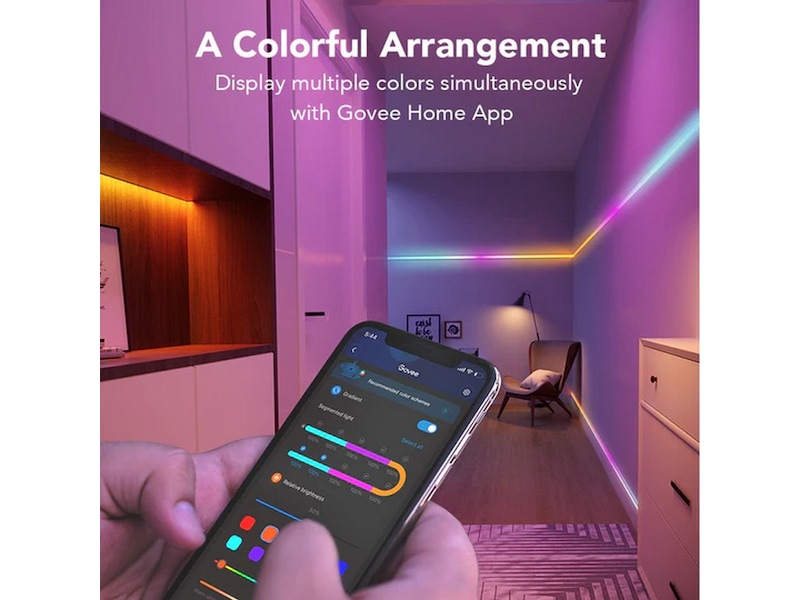 Innovativ RGBIC-teknologi lar deg justere hvert segment av lyslistene for seg. Du kan kontrollere lysstyrken, musikkmodusene, farger og effekter ved hjelp av Govee Home-appen.