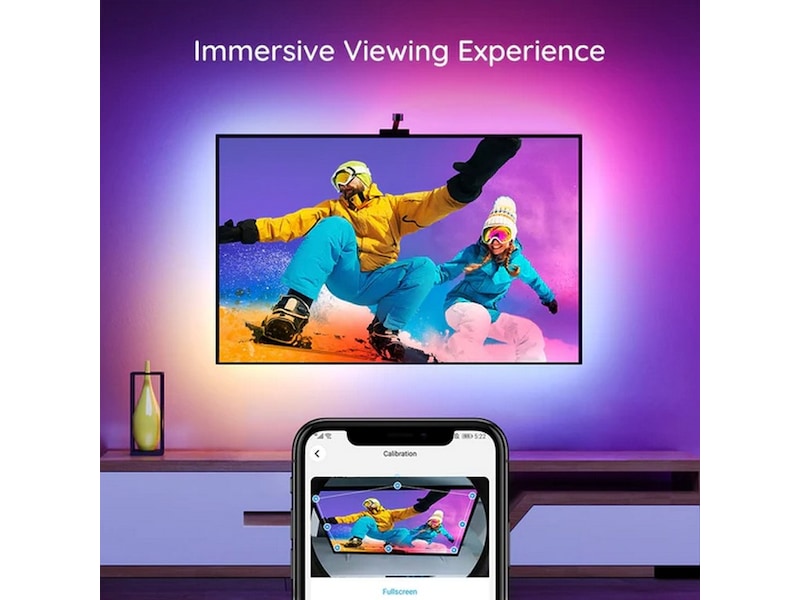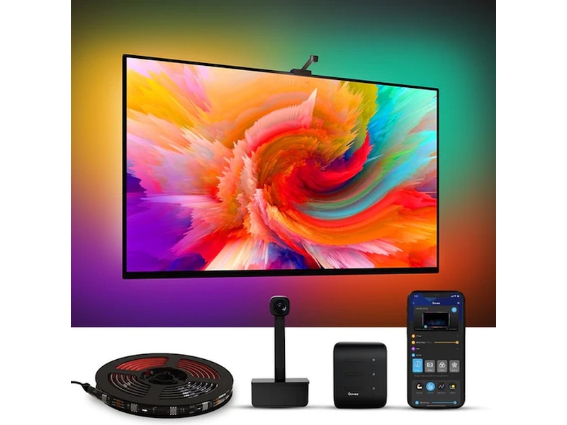 Govee Envisual-kameraet vårt gjenkjenner og fanger opp fargene på TV-skjermen på en intelligent måte og justerer deretter bakgrunnsbelysningen automatisk. Utvid spilluniverset ditt utover de fire hjørnene på TV-skjermen.