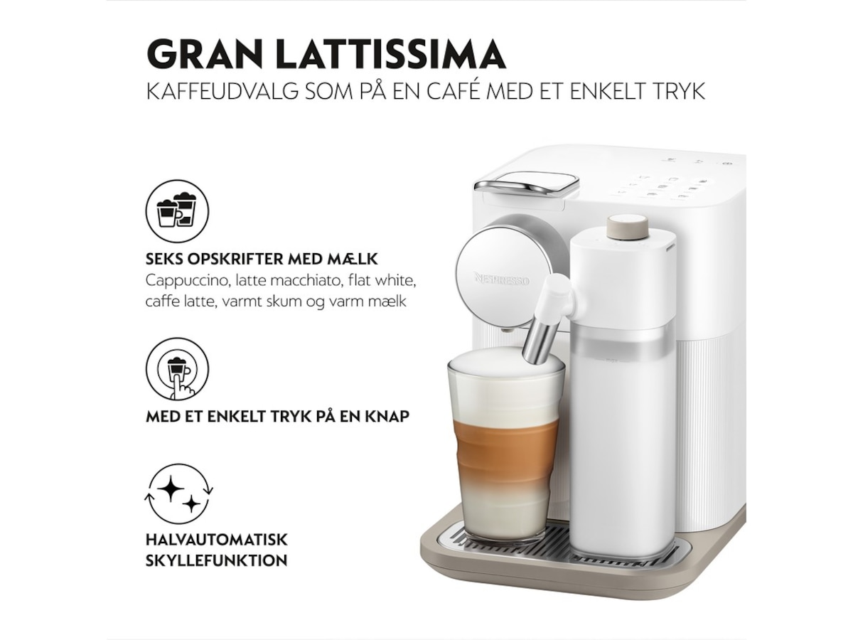 Gran Lattissima er den nye generasjonen av maskiner der du kan brygge kaffe med melk bare ved å trykke på en knapp. Med tre forskjellige typer svart kaffe og seks oppskrifter med kaffe og melk som brygges ved å trykke på en knapp, gjør Gran Lattissima det mulig å nyte kaffe hjemme akkurat som på kafé, enkelt og praktisk.