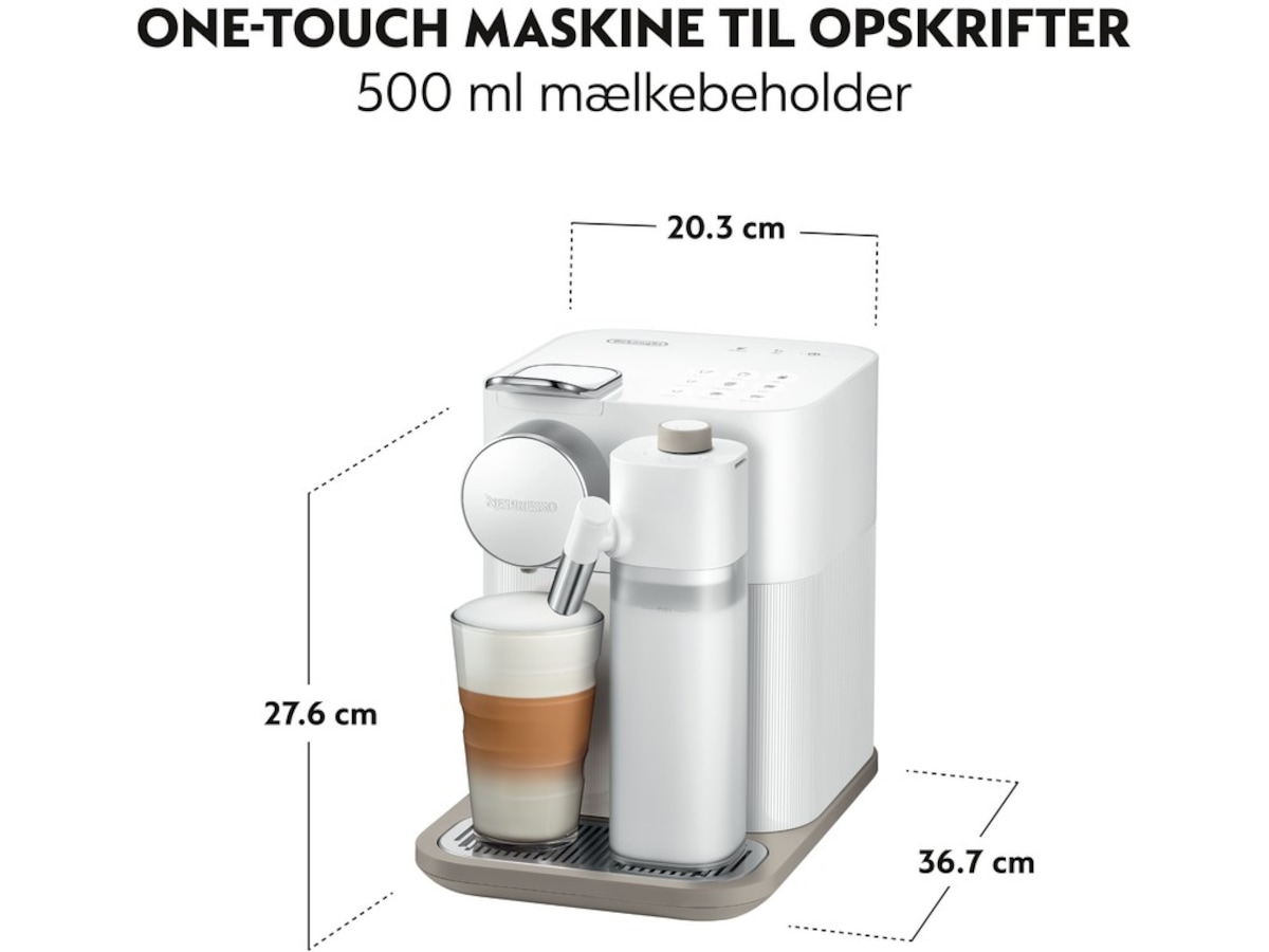 Nespresso Gran Lattissima kaffemaskin fra DeLonghi, hvitt One-touch-melkesystem: Et innovativt melkesystem der alle kaffe- og melkeoppskriftene dine er tilgjengelig med et knappetrykk.