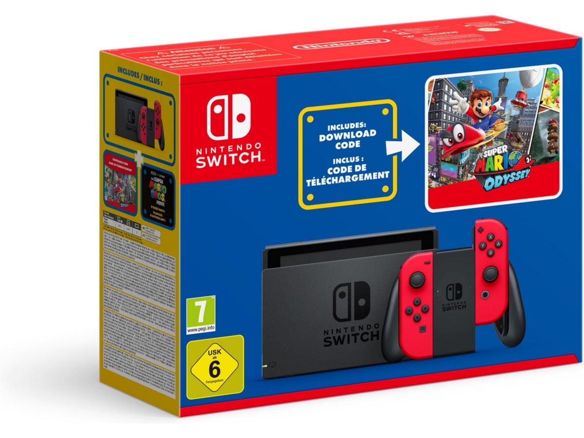 2 Joy-Con Wrist Straps, HDMI-kabel, Original Sticker (3 ark), AC-strømadapter, Super Mario Odyssey (nedlastingskode), Nintendo Switch Dock, Nintendo Joy-Con Grip