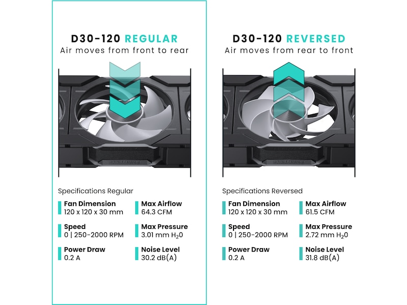 - Tilgjengelige modeller med vanlig og omvendt luftstrøm: Med modeller med vanlig og omvendt luftstrøm tilgjengelig, muliggjør D30-viften den perfekte konfigurasjonen uten å hindre viftebladets belysningseffekt.