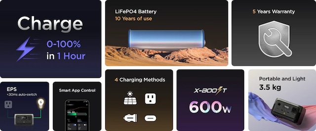 - 256 Wh kapasitet og 300 W effekt.