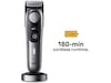 Bygd for å vare: Denne trimmeren for menn er 100 % vanntett for enkel rengjøring, har et kraftig Li-Ion-batteri med 180 minutters trådløs driftstid, skarpe blader som varer livet ut, ladestativ og et etui for oppbevaring på badet