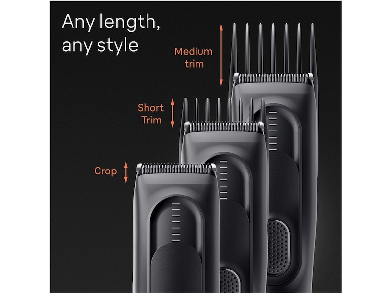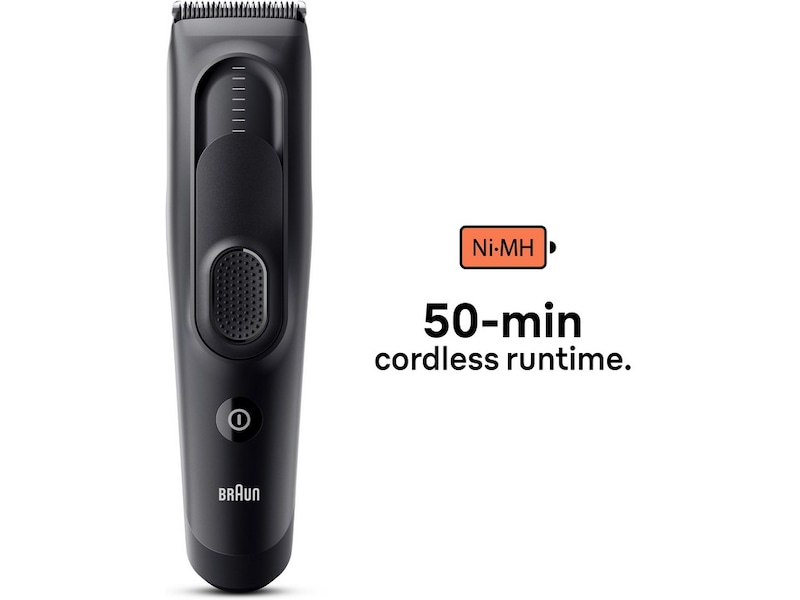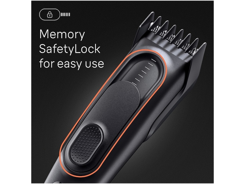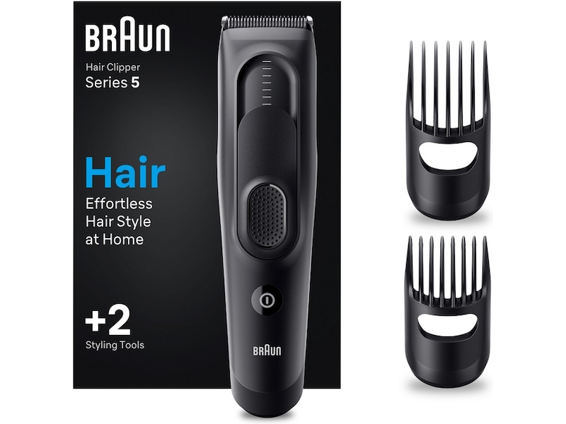 Effortlessly cut and style your hair from home: the ultra-sharp blades make hair trimming at home quick and easy—no matter the length or thickness. 17 lengths: choose from 2 combs or without a comb. Memory SafetyLock remembers & locks the last used setting for easy hair trimming at home. Built to last: the cordless hair clippers feature lifetime-sharp blades & a powerful Ni-MH battery with a 50-min runtime. Made for ease: the clippers’ ergonomic handle with rubberised grip is comfortable and the device can be easily cleaned under running water. Cuts all hair types: designed for versatile styles and makes a great gift for men. What's in the box Hair clipper Series 5 Small comb (3 – 24 mm) Big comb (14 – 35 mm)