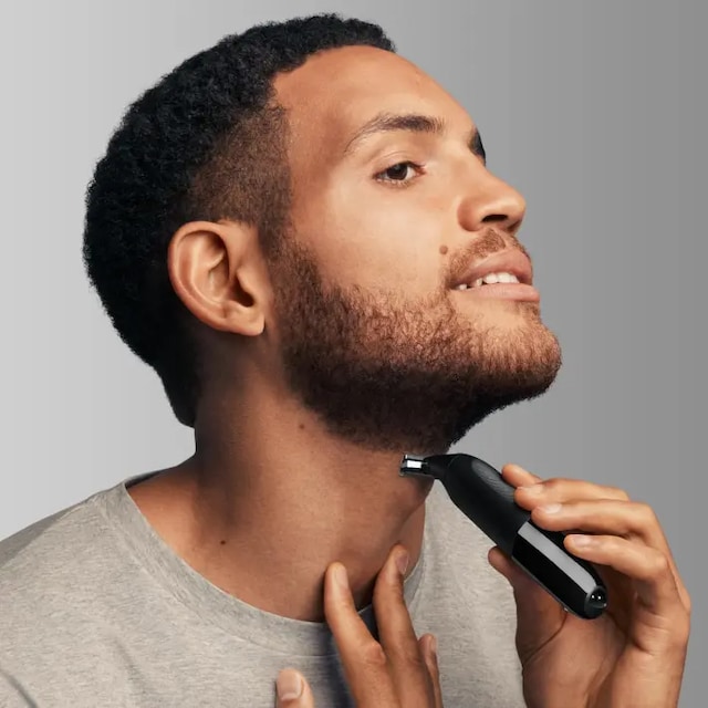 Designet for presisjon og kontroll: Klipp både opp og ned med toveiskammen. Sikker barbering vått eller tørt takket være det gummibelagte, sklisikre håndtaket.