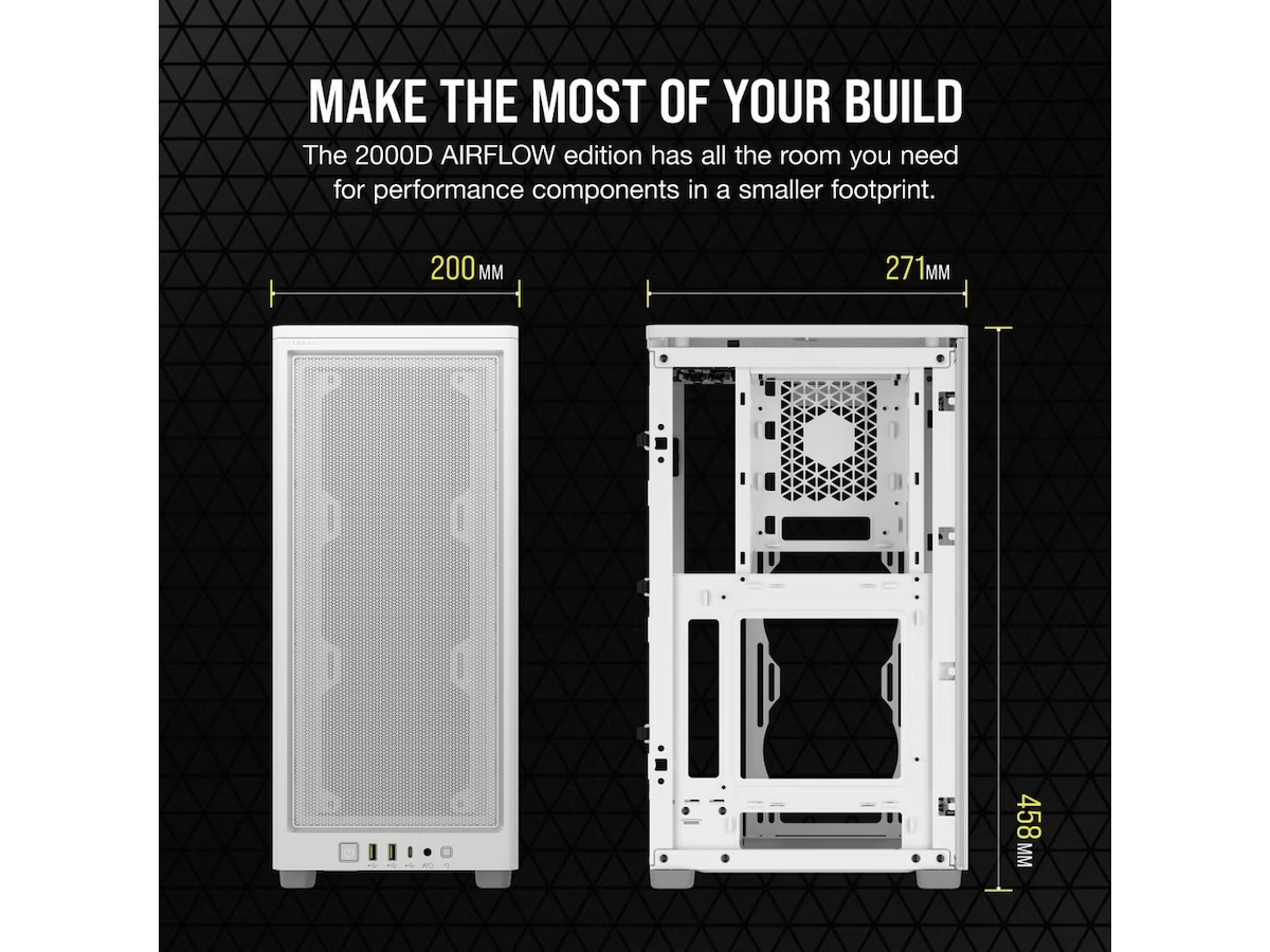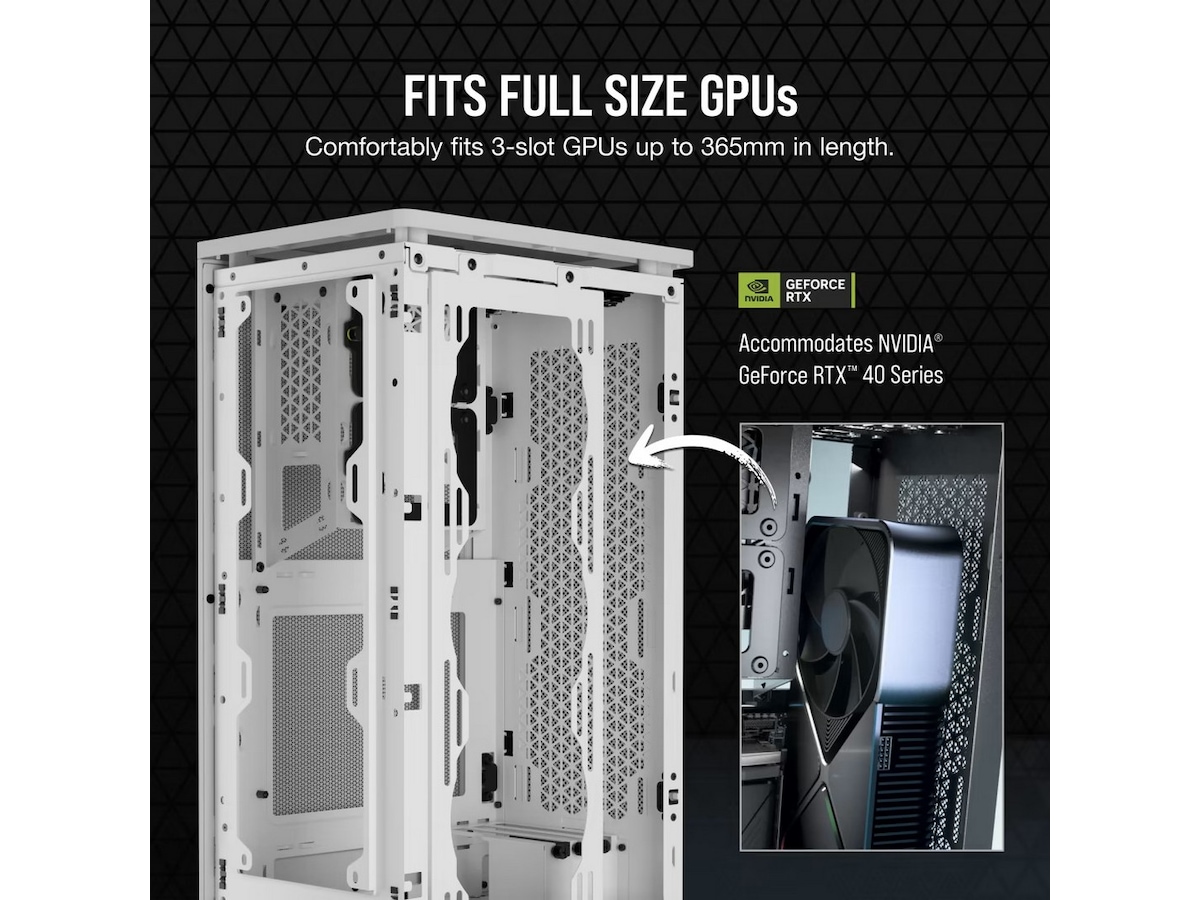 Du trenger ikke å ofre ytelsen med et SFF-kabinett. La GPU-en din i full størrelse puste inn et optimalisert indre som har plass til opptil 8 x 120 mm vifter og luftstrømspaneler i nettingstoff på alle sider.