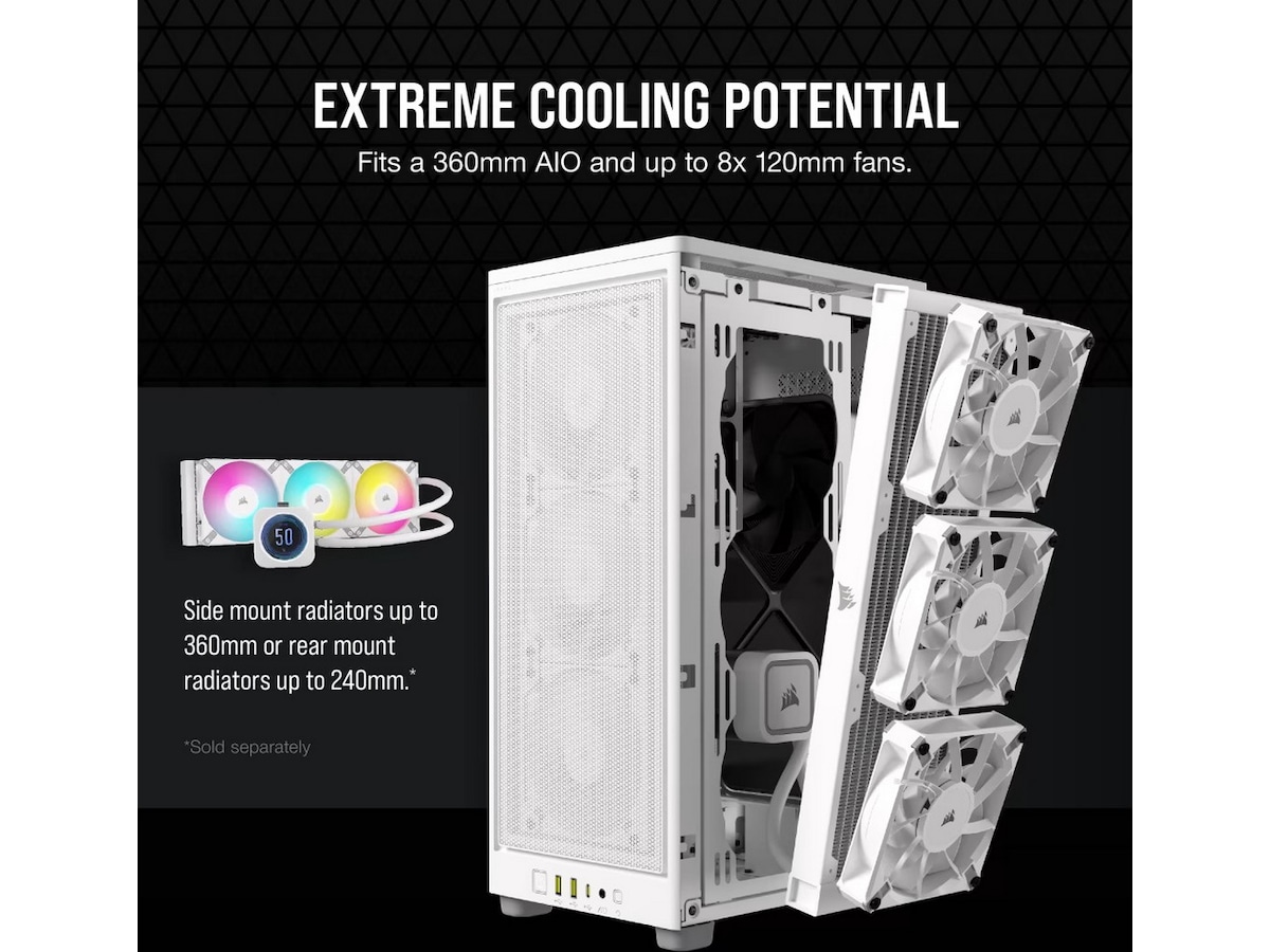 Passer komfortabelt for opptil 6 x 120 mm-vifter (slanke eller vanlige), med to ekstra viftemonteringssteder for GPU-kjøling når den brukes med GPU-er med ett spor.