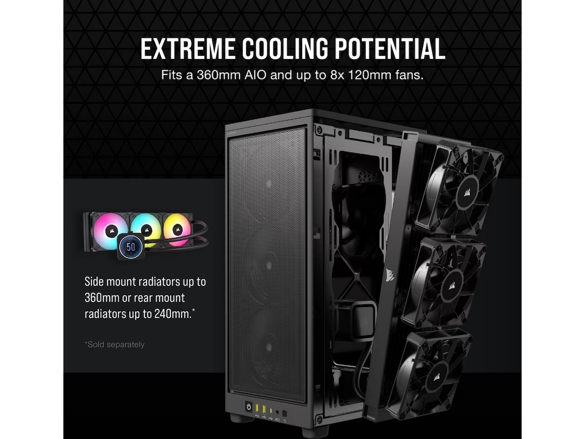 Støtte for flere AIO-kjølere, inkludert 360 mm på siden og 240 mm på baksiden (med en GPU med 1 spor).