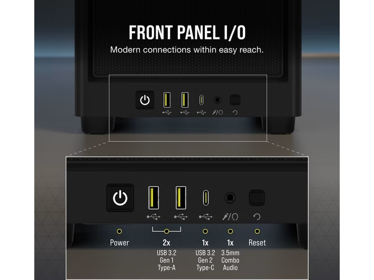 Du trenger ikke å ofre ytelsen med et SFF-kabinett. La GPU-en din i full størrelse puste inn et optimalisert indre som har plass til opptil 8 x 120 mm vifter og luftstrømspaneler i nettingstoff på alle sider.
