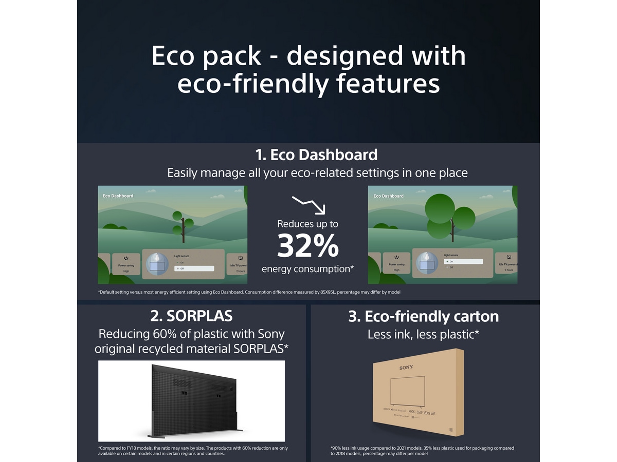 Egenskaper BRAVIA CAM-støtte, Innebygd Chromecast, Dual Database Processing, Tekstforstørrelse, Søvntidtaker, Skjermleser, CalMAN automatisk kalibreringsstøtte, Audio Description (AD)