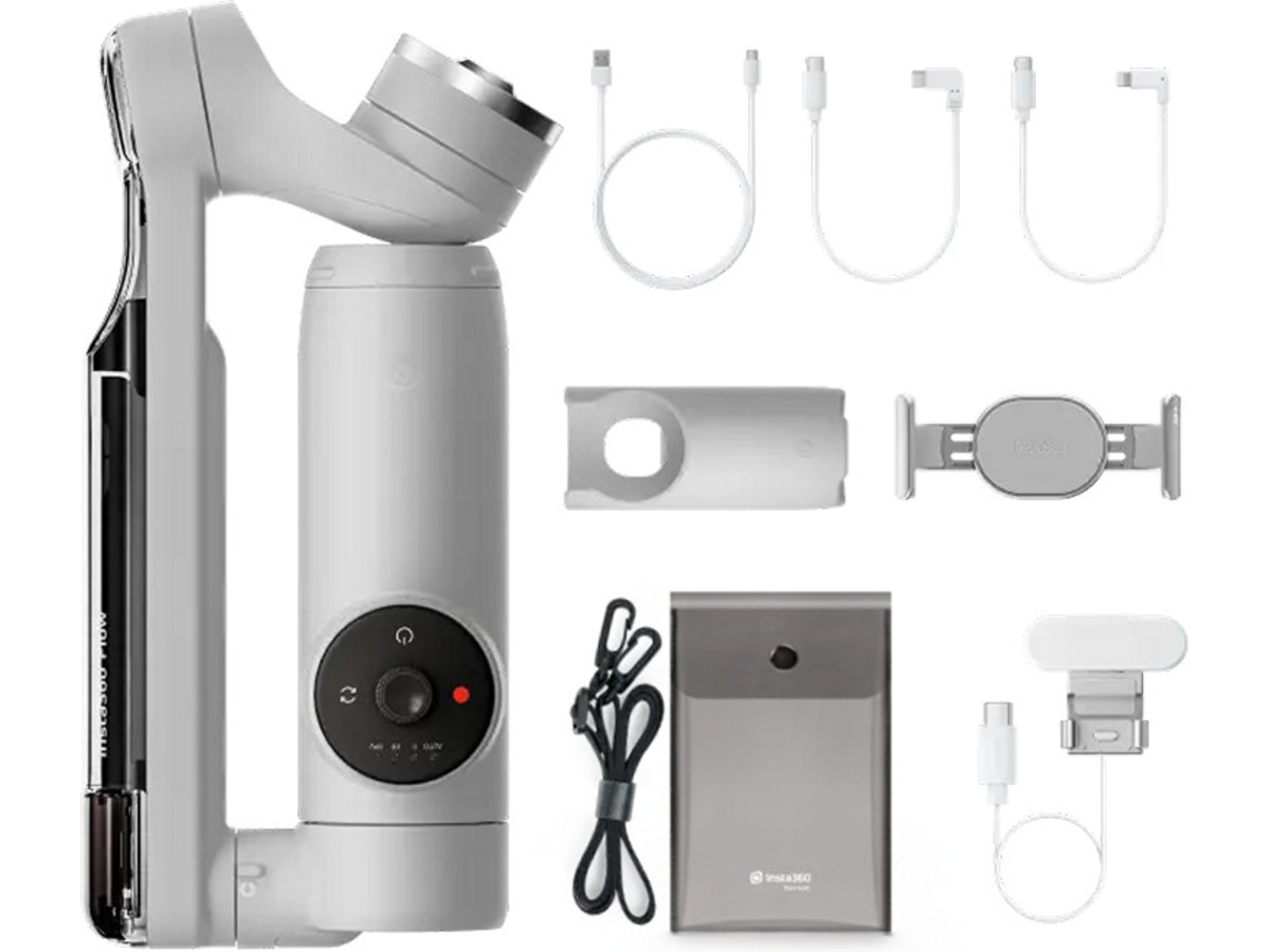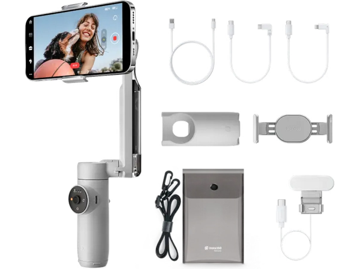 Creator Kit inkluderer 1x Insta360 Flow, 1x Spotlight, 1x magnetisk telefonklemme, 1x grepsdeksel, 1x bæreveske, 1x Type-C-til-A-ladekabel, 1x Type-C-til-C-kabel, 1x Type-C-til-Lightning-telefonkabel.