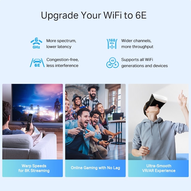 WiFi 6E utnytter mulighetene til 6 GHz for å muliggjøre applikasjoner med høy båndbredde som krever raskere datagjennomstrømming som høyoppløselig strømming av video og virtuell virkelighet, i tillegg til tilkobling med lavere ventetid for online spillapplikasjoner.