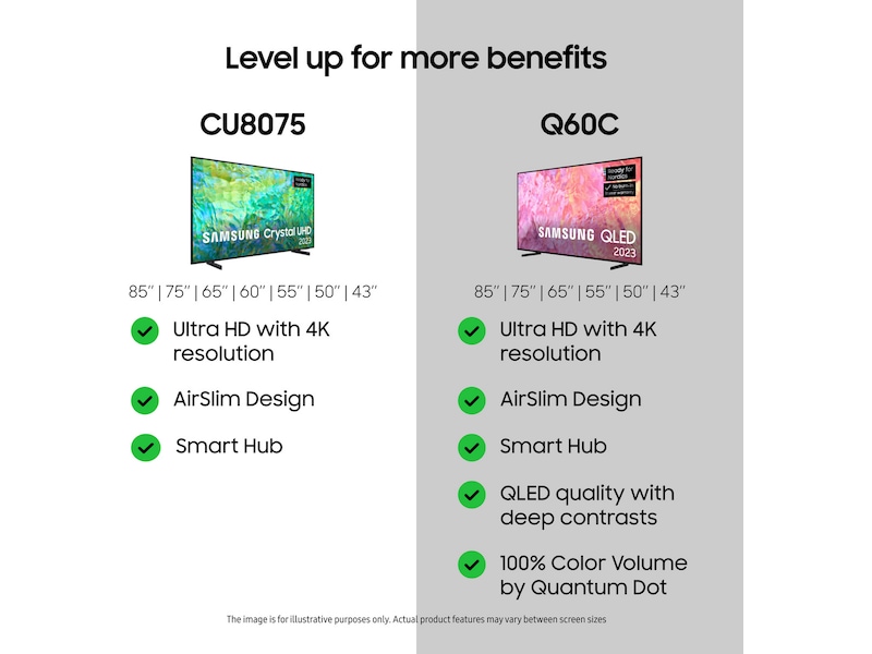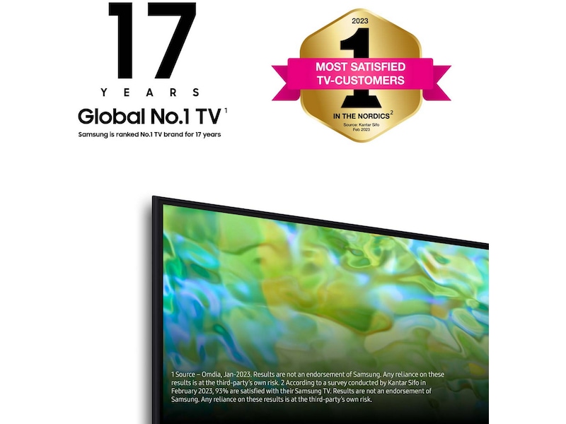 1 Kilde – Omdia, januar 2023. Resultatene er ikke ment som en anbefaling av Samsung. Tillit til resultatene skjer på tredjeparts eget ansvar. 2 Ifølge en spørreundersøkelse gjennomført av Kantar Sifo i januar 2023 er 93 % av de spurte fornøyde med sin Samsung-TV. Resultatene er ikke ment som en anbefaling av Samsung. Tillit til resultatene skjer på tredjeparts eget ansvar.3 Gjelder ved kjøp av utvalgte projektormodeller og utvalgte 2023-modeller av Samsung-TV på samsung.com og hos utvalgte forhandlere i perioden 20.04–31.12.2023. Underlagt begresninger, og strømmetjenestetilbudene som er inkludert, kan variere under kampanjen. Krever at kunden oppretter konto hos den aktuelle strømmetjenesten. Samsung kan vise reklame og kampanjer på Smart TV-grensesnittet og i applikasjoner. Tilgjengeligheten av apper kan variere over tid og avhengig av region.