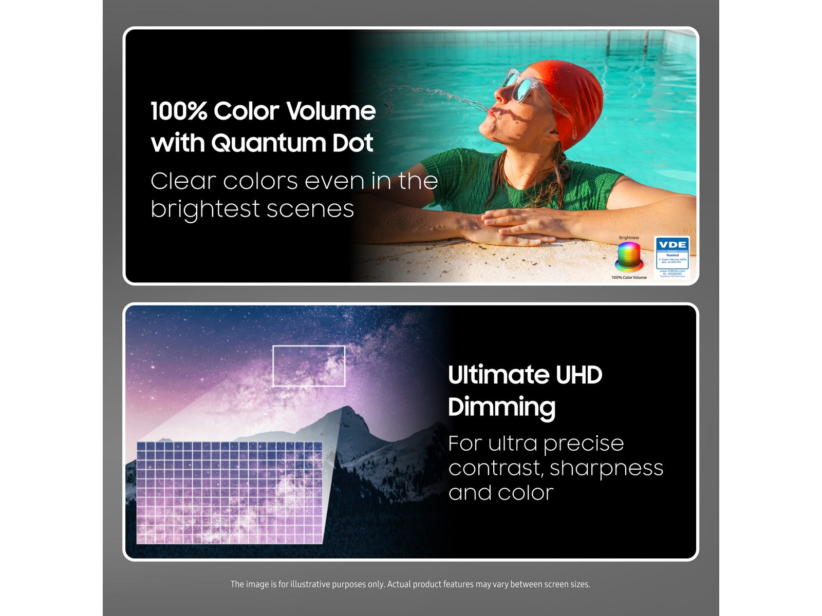 *100% Color Volume by QLED er målt i henhold til DCI-P3-standarden og sertifisert av VDE.