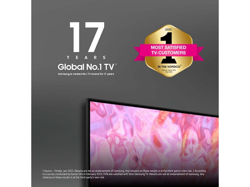 1 Kilde – Omdia, januar 2023. Resultatene er ikke ment som en anbefaling av Samsung. Tillit til resultatene skjer på tredjeparts eget ansvar. 2 Ifølge en spørreundersøkelse gjennomført av Kantar Sifo i januar 2023 er 93 % av de spurte fornøyde med sin Samsung-TV. Resultatene er ikke ment som en anbefaling av Samsung. Tillit til resultatene skjer på tredjeparts eget ansvar.3 Gjelder ved kjøp av utvalgte projektormodeller og utvalgte 2023-modeller av Samsung-TV på samsung.com og hos utvalgte forhandlere i perioden 20.04–31.12.2023. Underlagt begresninger, og strømmetjenestetilbudene som er inkludert, kan variere under kampanjen. Krever at kunden oppretter konto hos den aktuelle strømmetjenesten. Samsung kan vise reklame og kampanjer på Smart TV-grensesnittet og i applikasjoner. Tilgjengeligheten av apper kan variere over tid og avhengig av region. Vilkår: samsung.com/no/tvs/smart-tv/smart-start. 4 Garantien gjelder i 10 år fra kjøpsdato. Krever en kopi av kjøpskvittering og registrering på Samsungs nettsted innen 90 dager etter kjøp. Gjelder for kjøp av utvalgte 2023 TV-modeller mellom 20.04.2023 og 31.03.2024.