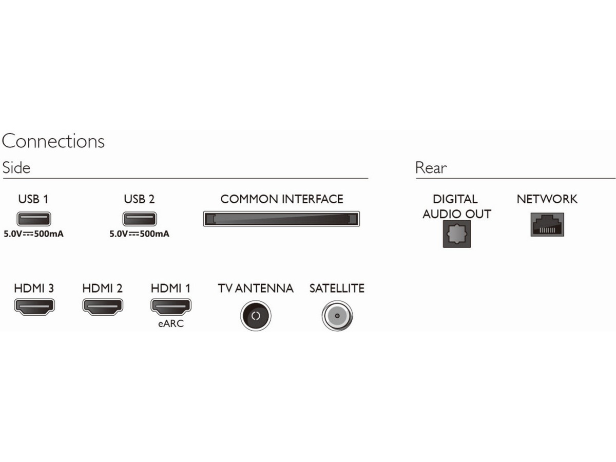 Andre egenskaper Clear Dialogue, Nattmodus, Voice Control, Dolby Volume Leveler, AI Sound, Dolby Bass Enhancement, Enhanced Audio Return Channel (eARC), AI-talestyring, Lydreturkanal (ARC), AI EQ