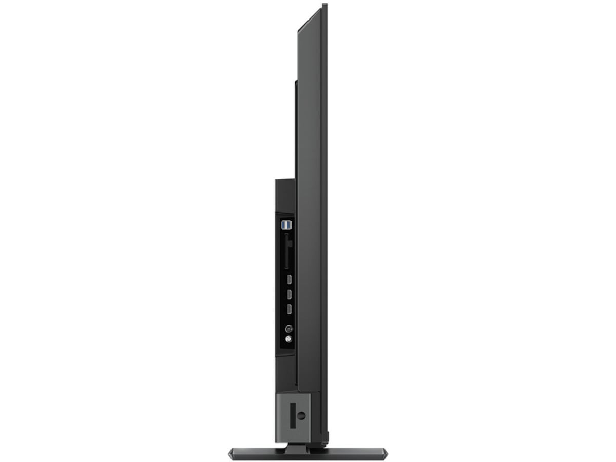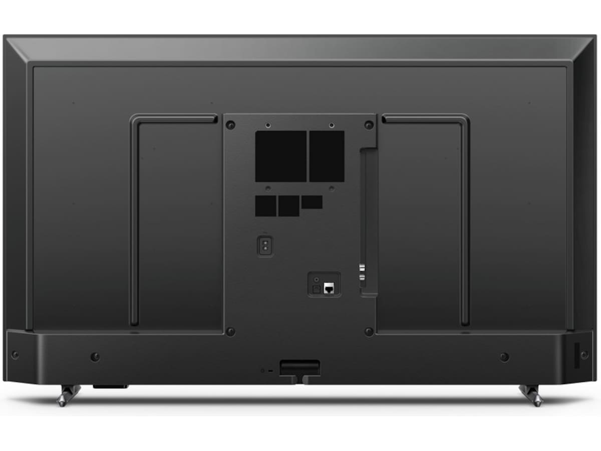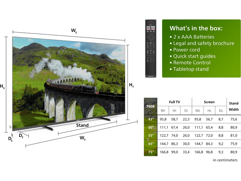 Den praktisk talt rammefrie skjermen til smart TV-en passer inn overalt. De slanke, mørkegrå føttene får det til å virke som om skjermen svever. Emballasjen bruker FSC-sertifisert resirkulert kartong og de trykte materialene kommer i resirkulert papir.