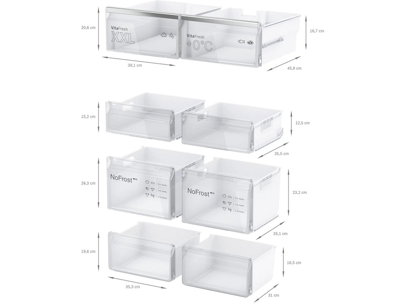 - VitaFresh XXL <0°C>:Holder maten fersk lenger i ekstra store, klimakontrollerte kjøleskapsskuffer.