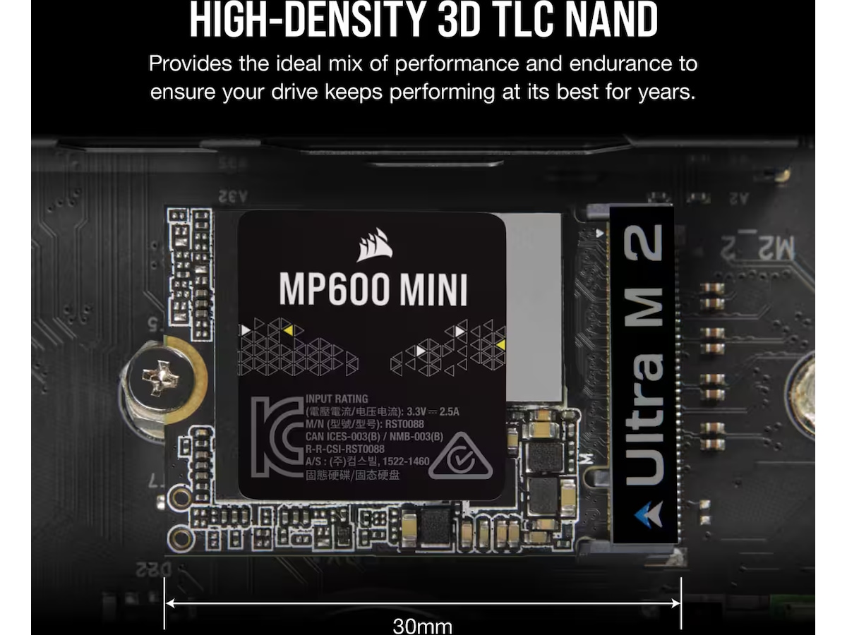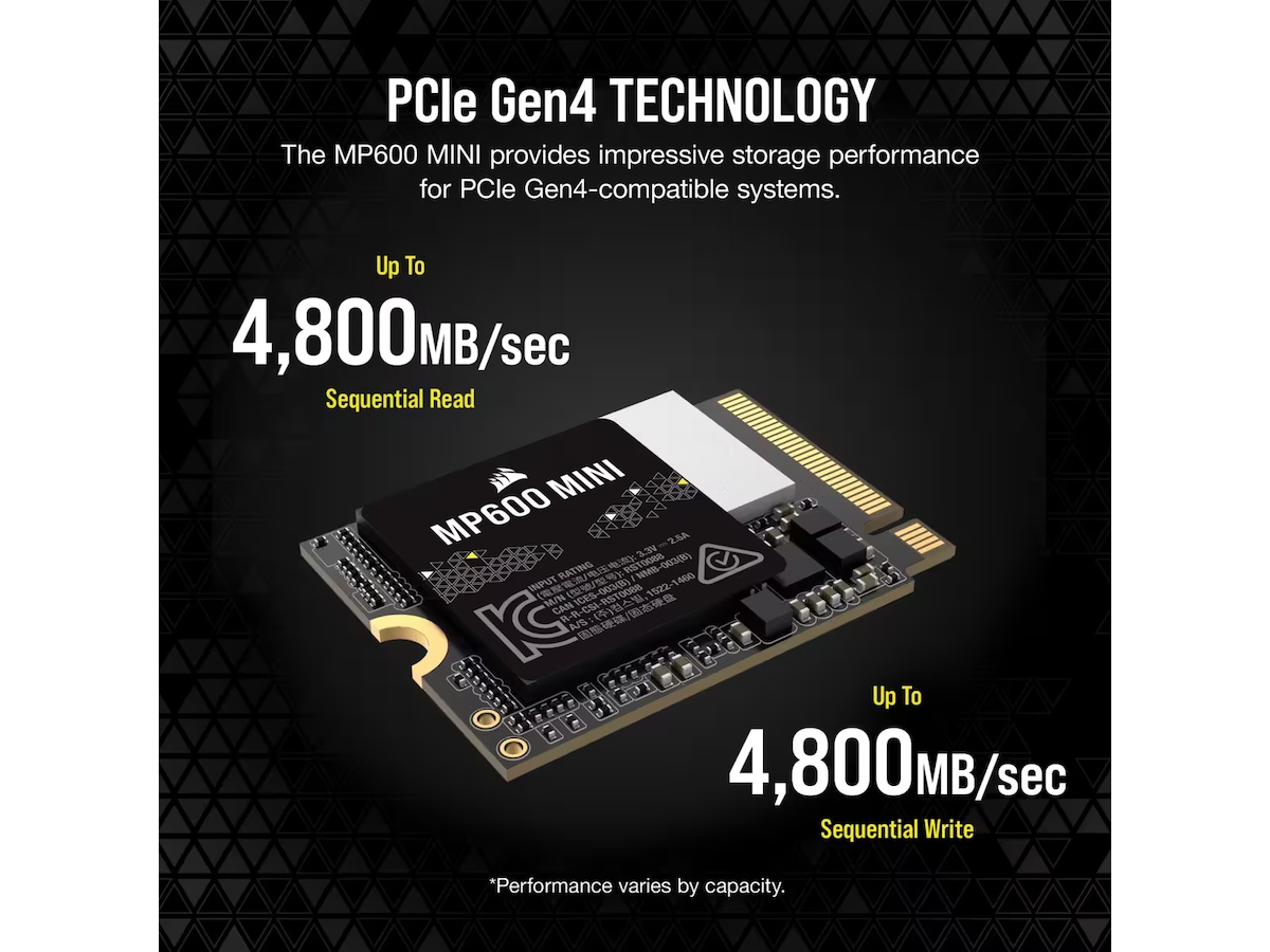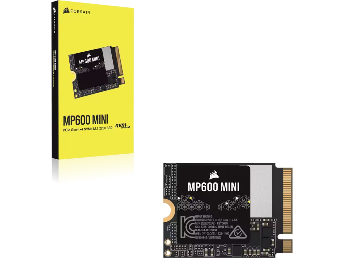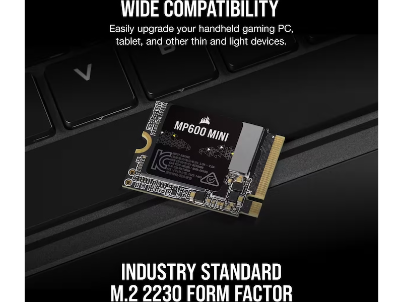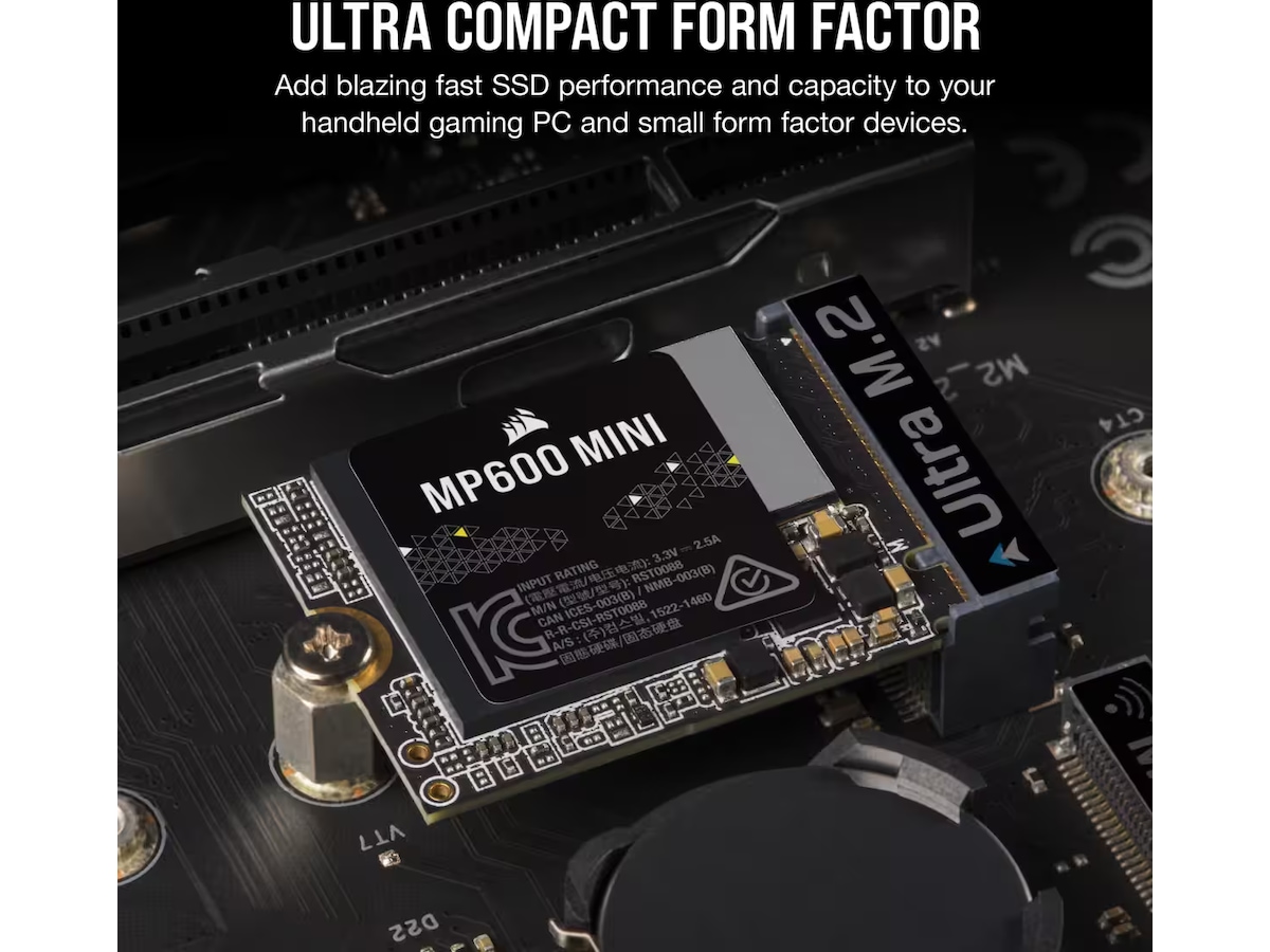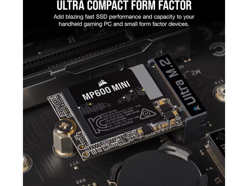 Corsair MP600 MINI Gen4 PCIe x4 NVMe M.2 SSD ULTRA KOMPAKT FORMFAKTOR Legg til lynrask SSD-ytelse og kapasitet til den håndholdte gaming-PC-en og de små formfaktorenhetene.