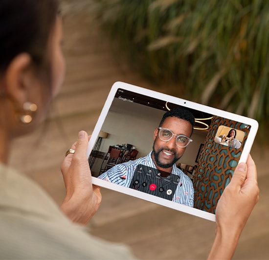 Ha videosamtaler i HD med Google Meet. Kameraet følger deg, slik at du kan bevege deg rundt i rommet uten å forsvinne ut av bildet. Google Tensor G2 bruker også AI til å gjøre deg mer synlig, selv i svakt lys.