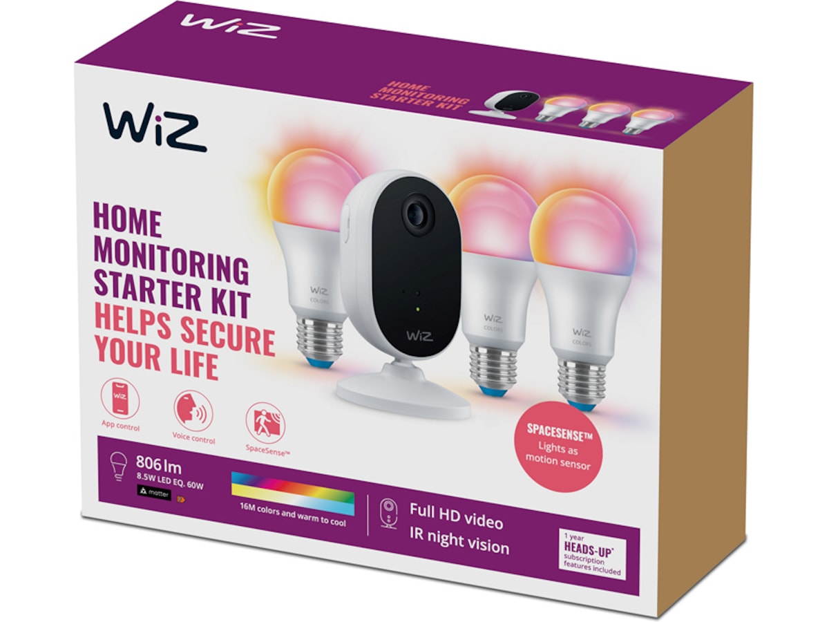 Dette startsettet med WiZ innendørskamera og tre WiZ A60 fargepærer er den perfekte tilføyelsen til WiZ-lyskildene dine da de til sammen tilbyr den komplette løsningen til både å kunne forebygge innbrudd og registerere og få beskjed om aktivitet i hjemmet ditt – uansett om du er rett i nærheten eller lagt vekk hjemmefra. Kameraet kan plasseres hvor som helst og aktiveres av bevegelse, lys og via WiZ-appen.