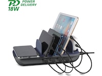 USB-ladestasjonen med Qi er en flott måte å lade enhetene dine raskt og enkelt på. Med fire USB-A-porter og en USB-C-port med Power Delivery og QC3.0 kan du lade en rekke enheter. Enten du har en smarttelefon, nettbrett eller smartklokke, er denne ladestasjonen universell og fungerer med en rekke enheter.
