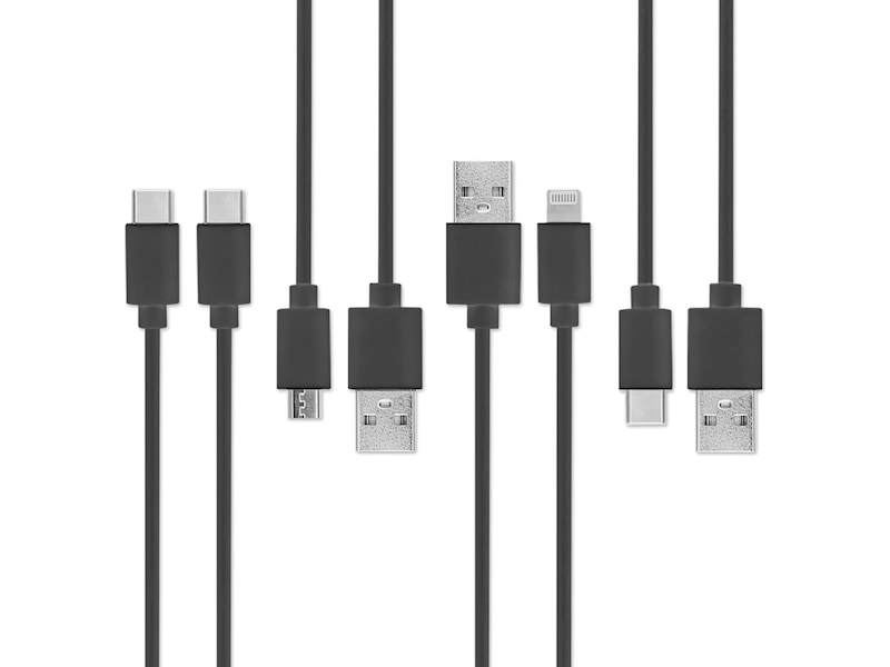 • Inkludert:2x USB-A til Lightning-kabel, 1x USB-A til Micro-USB-kabel, 1x USB-A til USB-C-kabel, 1x USB-C til USB-C-kabel