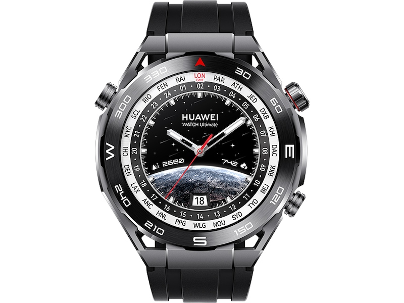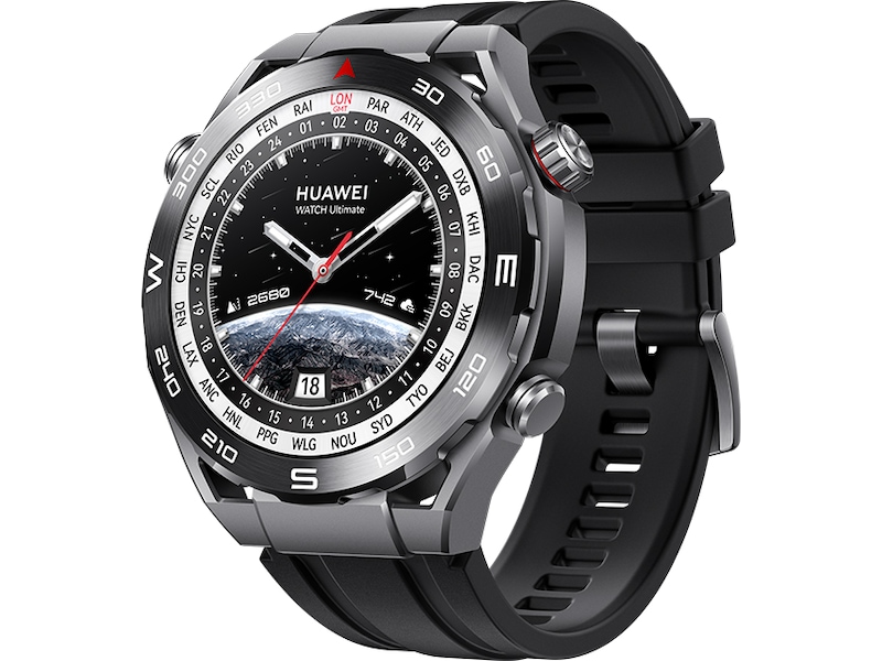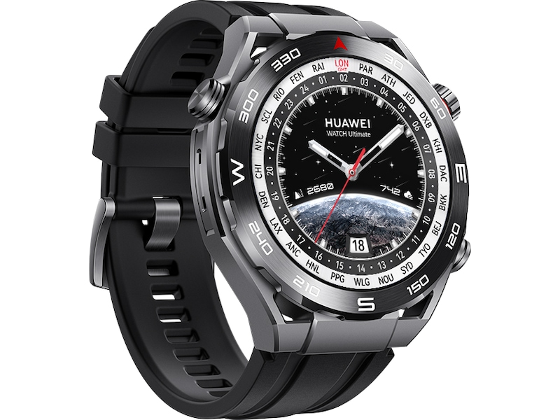 Huawei Watch Ultimate er en elegant smart sportsklokke med vanntett kapasitet ned til 100 meters dyp. Den lette og veldesignede klokken er ripe- og slitebestandig. Den tilbyr intelligente oppkoblinger, trådløs lading, meldingsassistent, butikk med ulike klokkeskiver, musikkavspilling stemmeavspilling under treningsøkter, søvnmåling, treningsmåling og hjerterytmemåling, GPS og EKG..