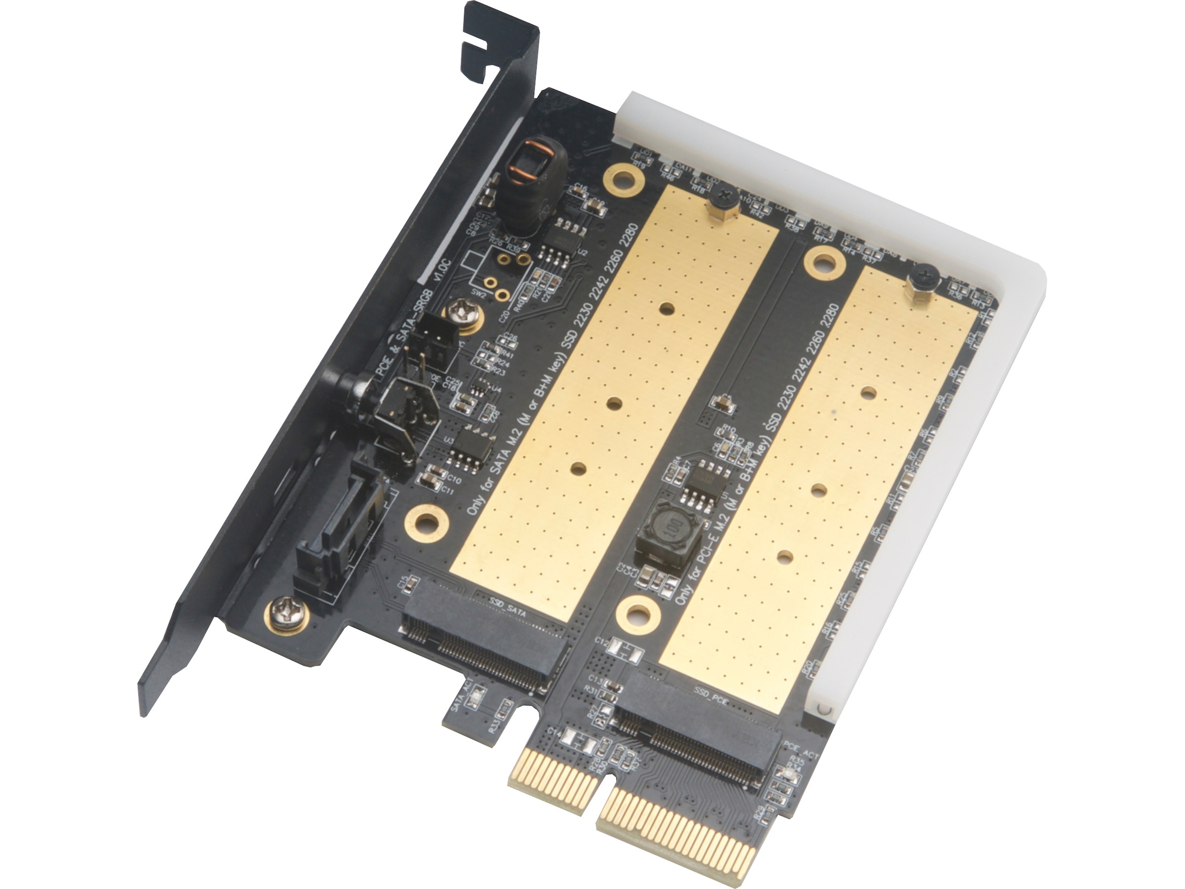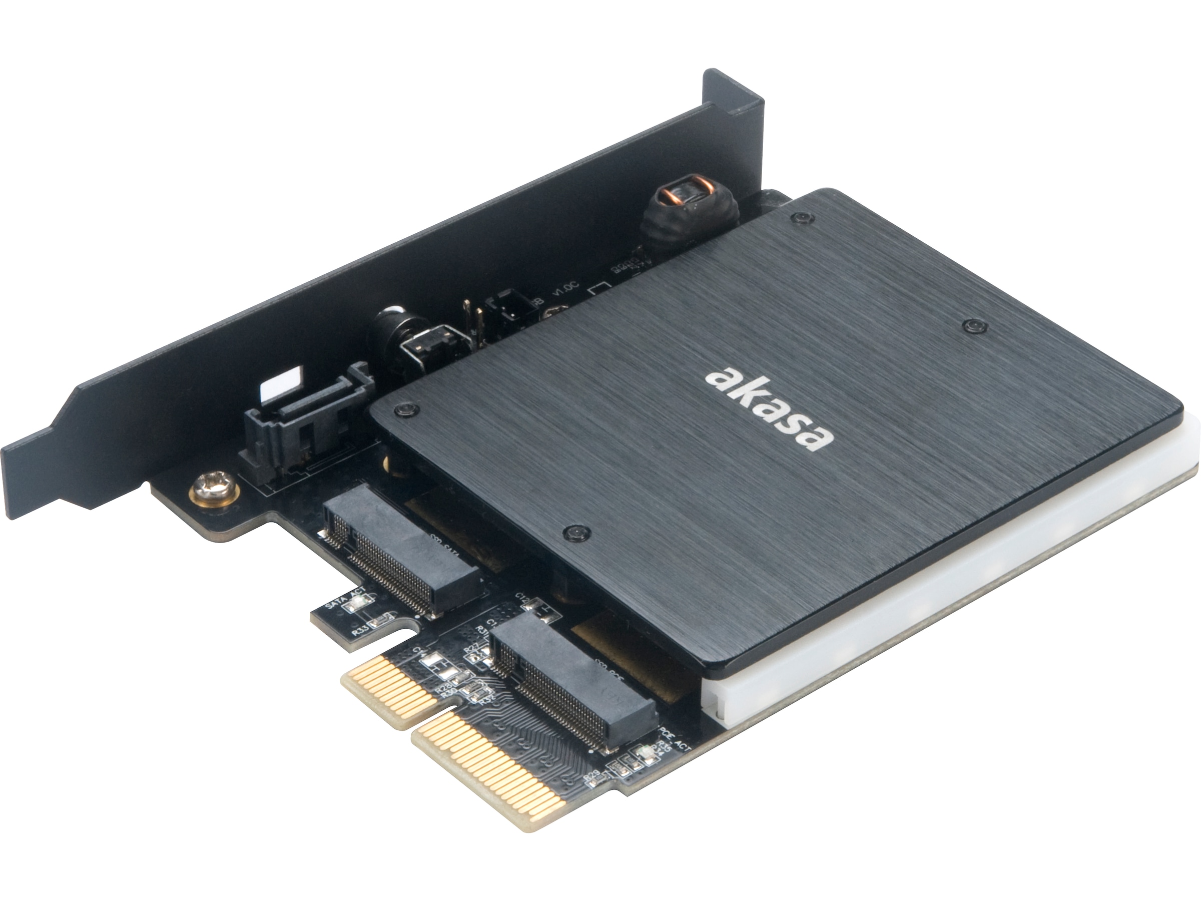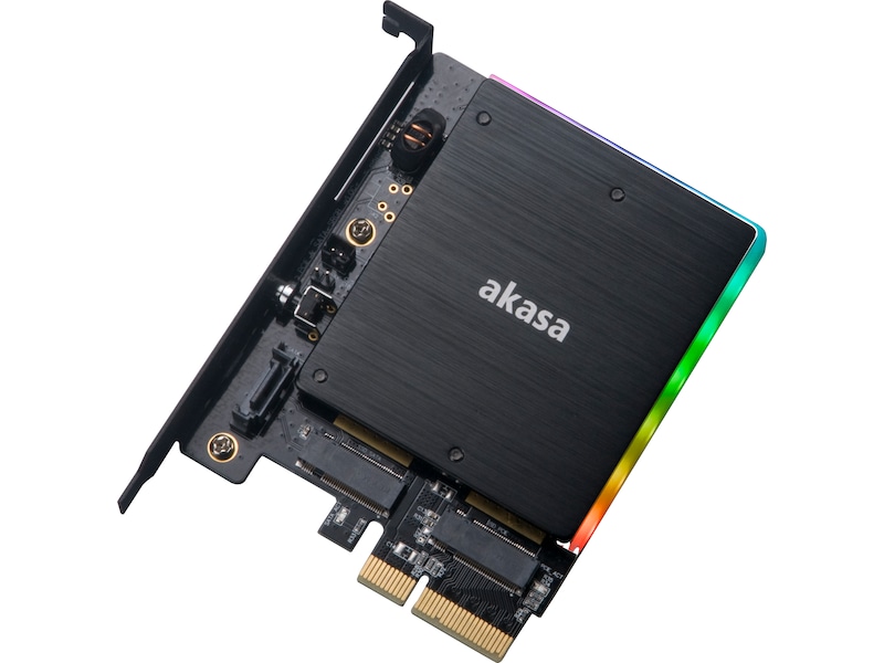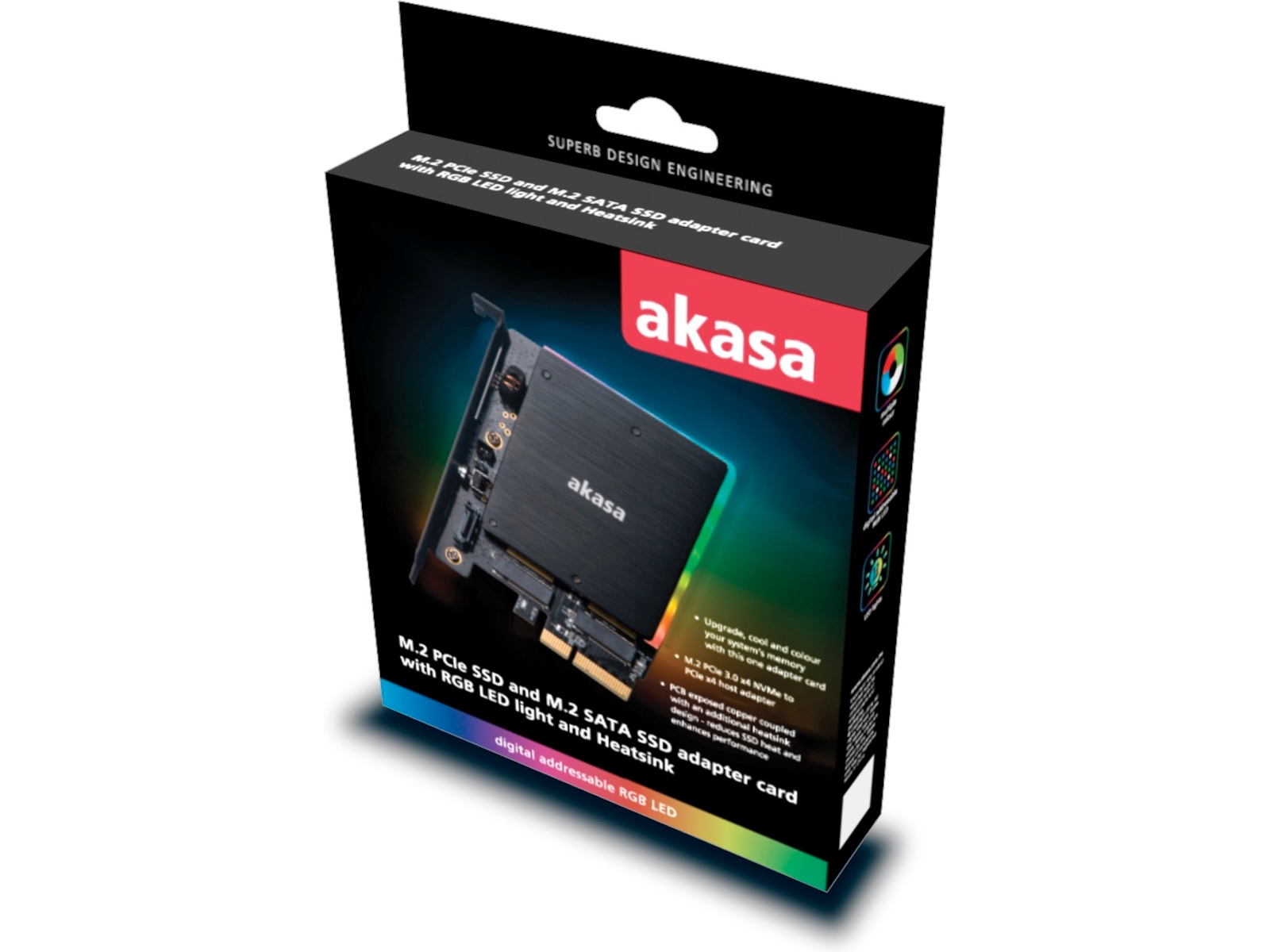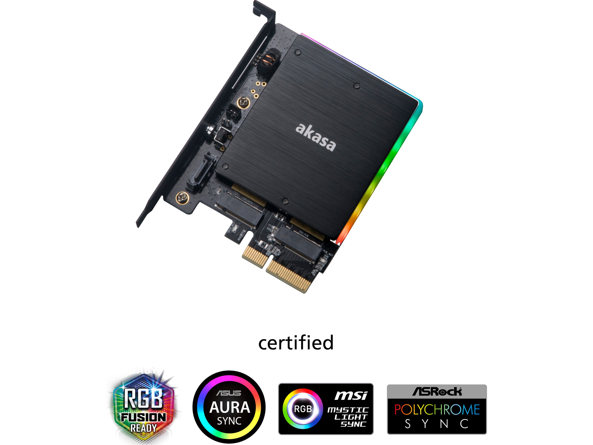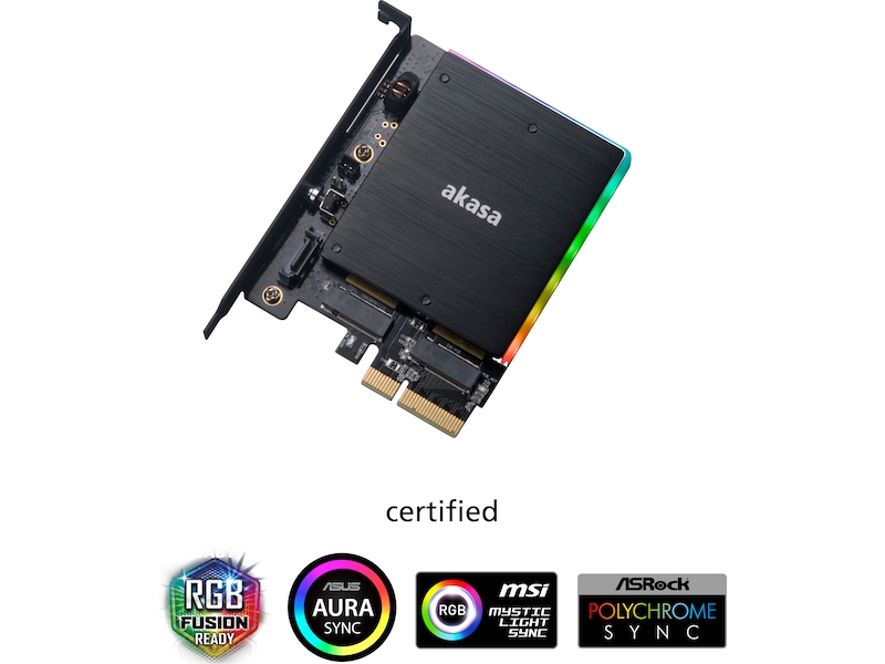Kjølig og fargerik M.2 SSD-lagring. Fungerer samtidig med en M.2 PCIe (NVMe) SSD og en M.2 SATA SSD. Kompatibel med PCIe 3.0 Gen3 x4-, x8- eller x16-spor.