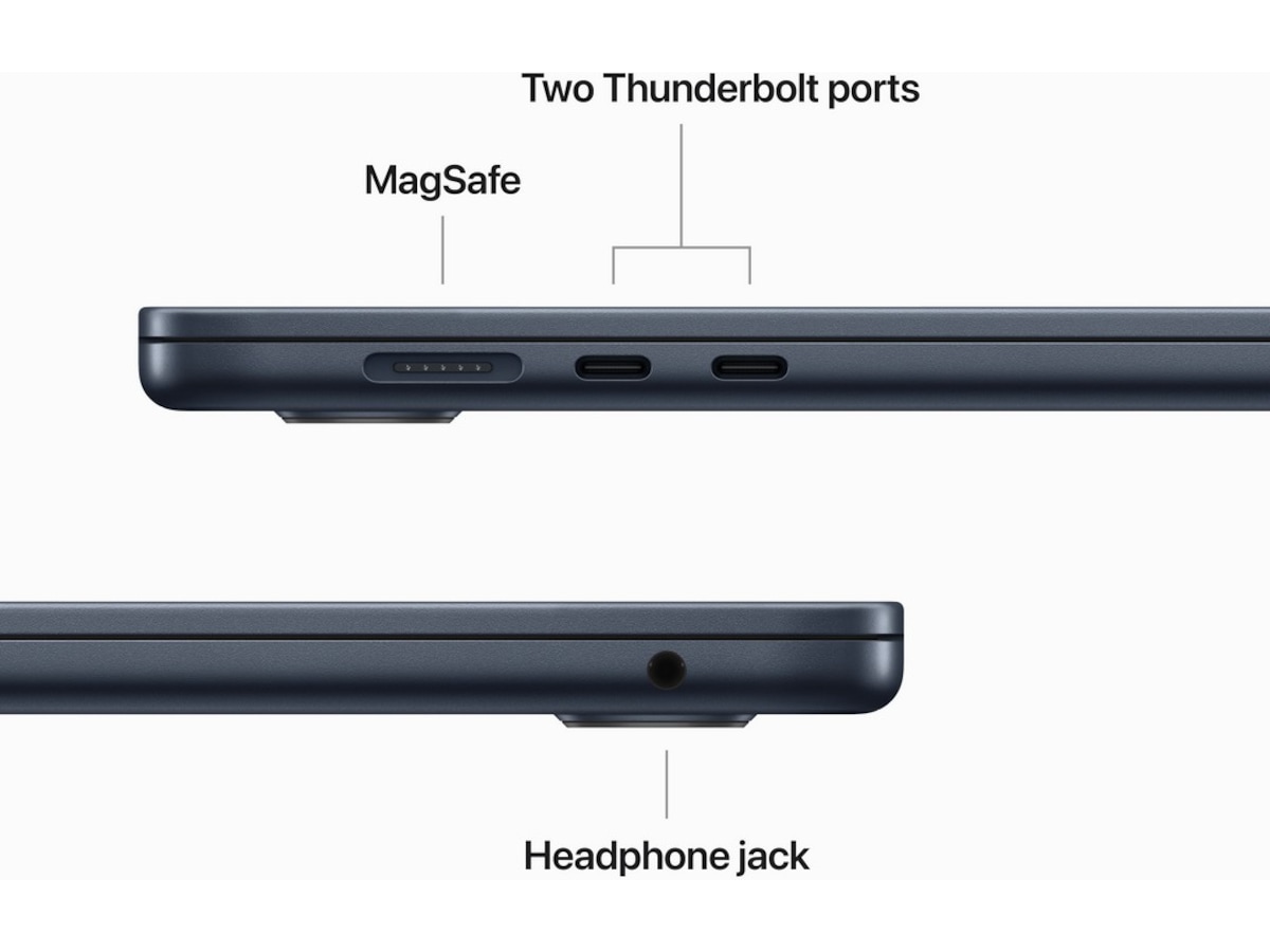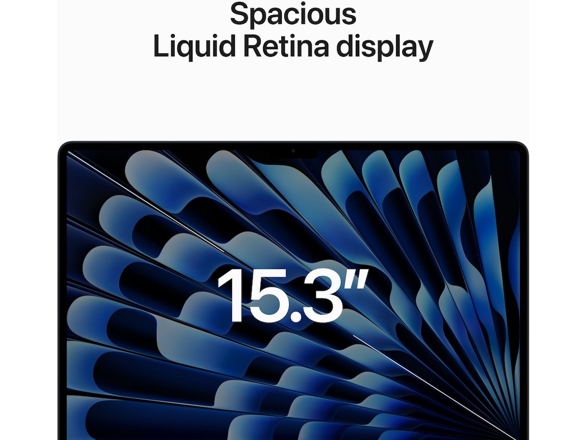 3)Skjermen på 15-tommers MacBook Air har avrundede hjørner på toppen. Skjermen måler 15,3 tommer på diagonalen i et rektangel. (Den faktiske synlige skjermflaten er mindre.)
