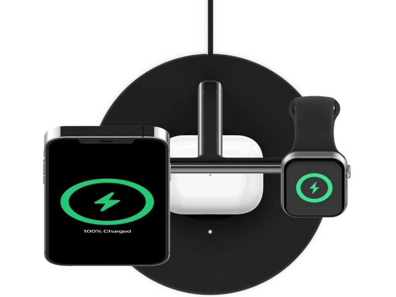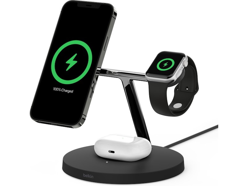 Et MagSafe-ladestativ på 15 watt gir strøm til din iPhone og en kraftig magnetisk lademodul lader din Apple Watch, mens en praktisk plate gir strøm til dine AirPods.