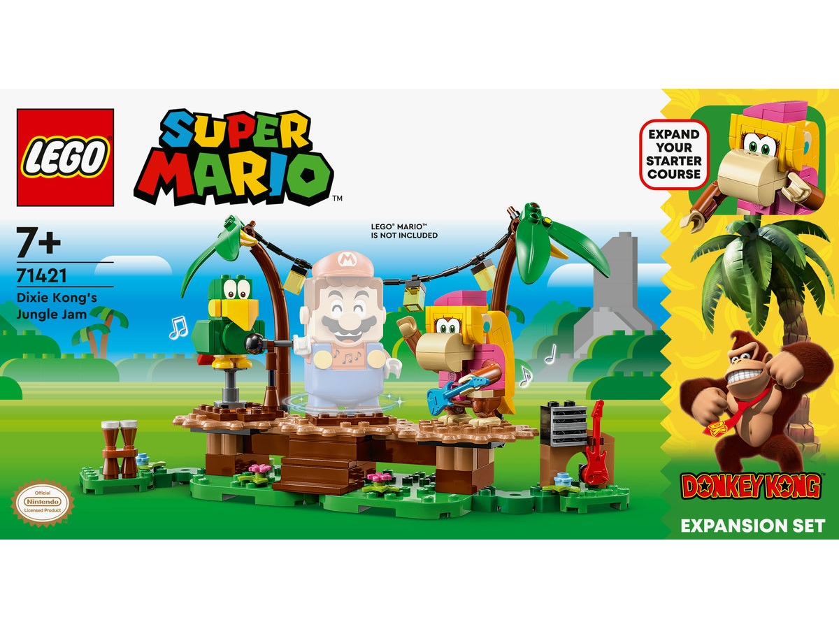 Med LEGO® Super Mario™ Dixie Kongs Jungle Jam – ekstrabanesett (71421) kan barn dra inn i jungelen for å spille musikk og ha det gøy med Donkey Kong. Settet inkluderer figurer av Dixie Kong og Squawks, en byggbar scene, et jungelmiljø og musikkinstrumenter og -utstyr. Sett LEGO® Mario™, LEGO® Luigi™ eller LEGO® Peach™ (figurene følger ikke med) på scenen, og vri dem rundt for å få de tilkoblede plattformene til å rotere, slik at musikken aktiveres. Merk: Du må ha startbane 71360, 71387 eller 71403 for å kunne spille interaktivt.