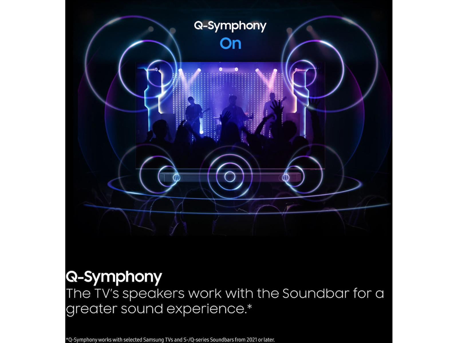 Q-Symphony leverer tilpasset lyd i hver kanal gjennom både TV-ens og soundbarens front-, side- og oppovervendte høyttalere for en fullendt akustisk opplevelse.