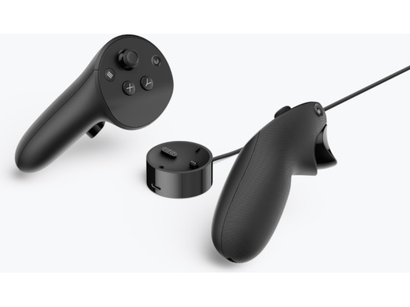 Kan brukes med Meta Quest 2, og kommer i esken sammen med Meta Quest Pro. Kompakt ladestasjon er inkludert.