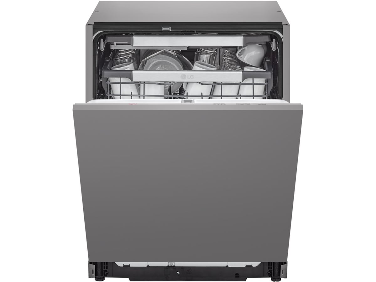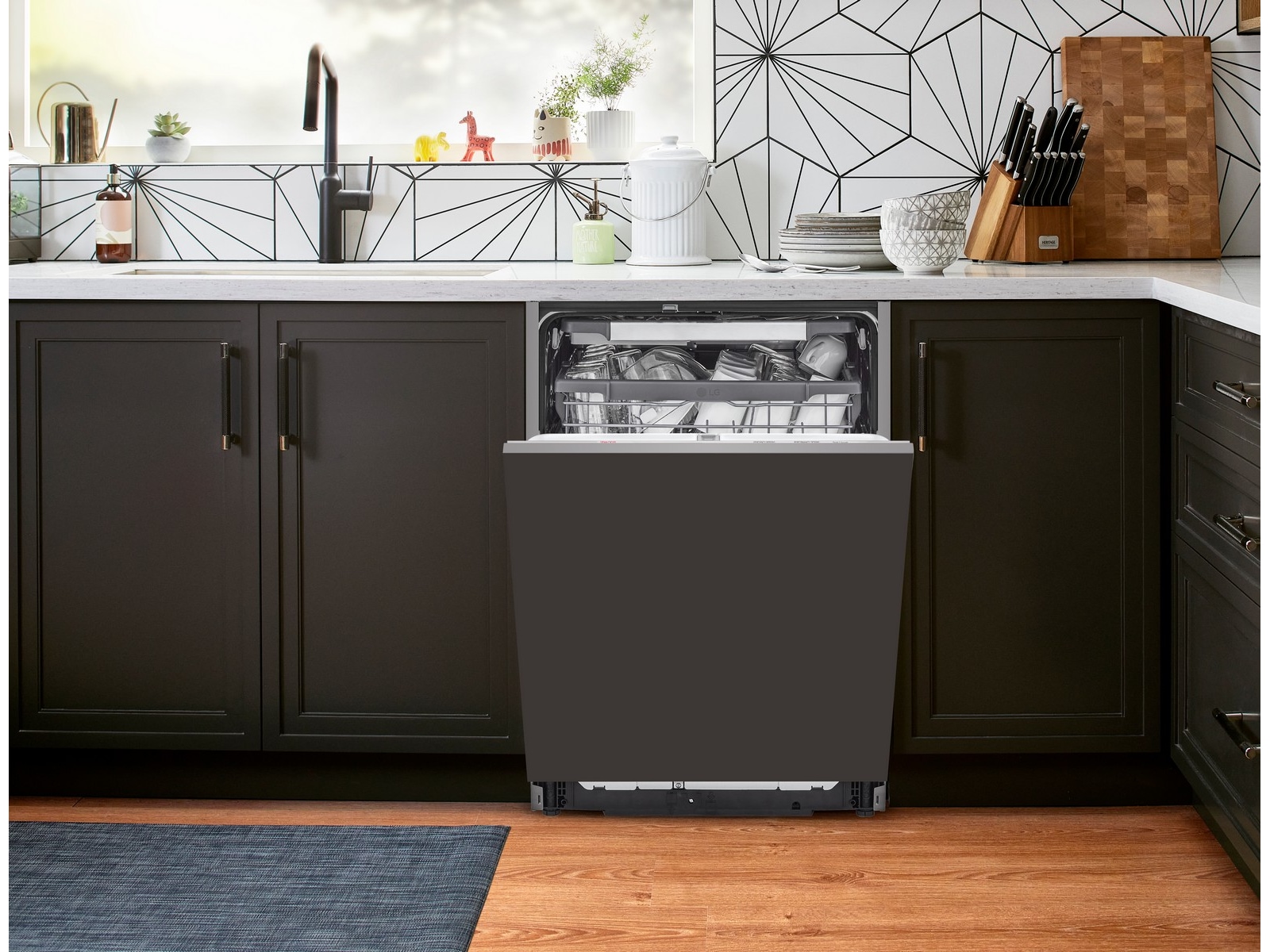 Last ned nye vaskesykluser for gryter, panner, glass og mer fra LG ThinQ™-appen. Kjøkkeninnredning med delvis åpen innebygd oppvaskmaskin og LG ThinQ™-app som viser varsling om at syklusen er ferdig.