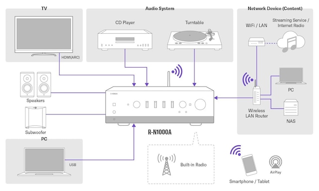 Enten det er lyd du har lagret på PC-en, eller en nettverksstasjon, eller det er vinylplater og TV, så håndterer R-N1000A alt – noe som gir deg overlegen lyd og henter ut den fulle lyddybden i alt av underholdning.