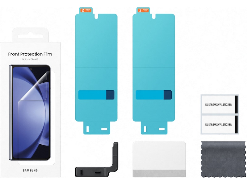 2 skjermbeskyttere, Applikator, 2 støvfjerneetiketter, Renseklut av mikrofiber, Nal