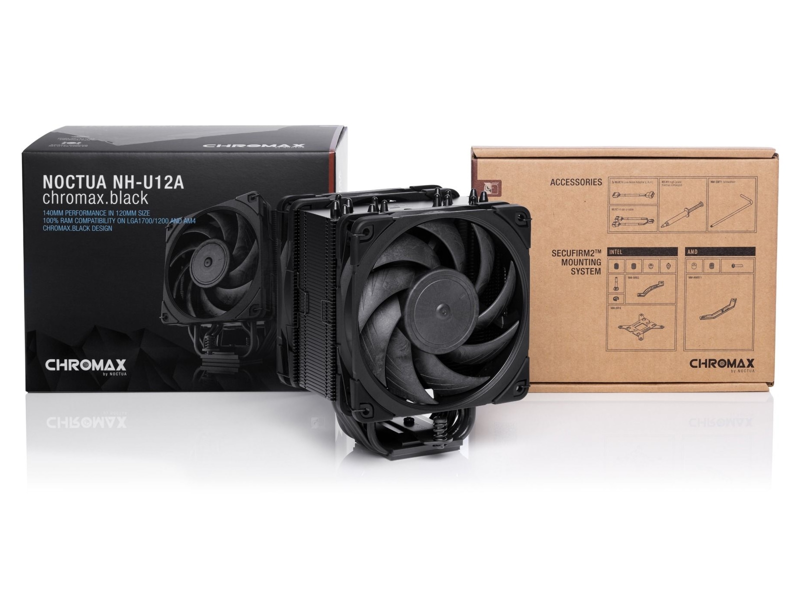 NH-U12A chromax.black er en helsvart versjon av Noctuas prisvinnende NH-U12A førsteklasses stille CPU-kjøler. Takket være den samme velprøvde asymmetriske enkelttårn kjøledesignen og topp moderne NF-A12x25 PWM-vifter, holder den seg tro mot NH-U12As suksessformel med å kombinere best-i-klassen kjøleytelse med fantastisk stillegang og enestående RAM-, kabinett- og PCIe-kompatibilitet. Samtidig kombinerer chromax.black-versjonen med sine svarte vifter og svart belagt kjøleribbe disse fordelene med et elegant stealth-utseende. Toppet med det anerkjente SecuFirm2™ fler-sokkel monteringssystem, Noctuas entusiastklasse NT-H1 termisk sammensetning og full 6-års produsentgaranti, er NH-U12A chromax.black et luksuriøst valg for kunder som søker en svært kompatibel 120mm kjøleribbe som kan konkurrere med ytelsen til 140mm enheter og ser akkurat så bra ut som den kjøler.