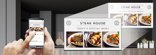 Du kan enkelt lage ditt eget innhold ved hjelp av LGs Promota*-applikasjon, som kan lastes ned til en mobilenhet. Med Promota kan du legge til tekst og bilder for å opprette en online profil for virksomheten din og levere informasjon som nyheter om begivenheter, sesongbaserte menyer, kampanjer og enda mer til kundene dine, samtidig som du anbefaler brukervennlige maler som er relevante for bransjen din.