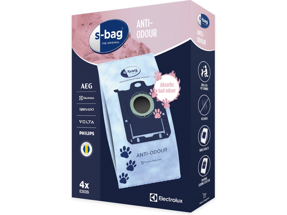 i motsetning til vanlige papirposer som absorberer fuktighet, bruker s-bag® Anti-Odour et motstandsdyktig syntetisk materiale belagt med en luktabsorberende voks for å fange opp ubehagelig lukt og hindre at den kommer ut av støvsugeren. Eiere av kjæledyr vil virkelig sette pris på denne unike lukt-knuseren.