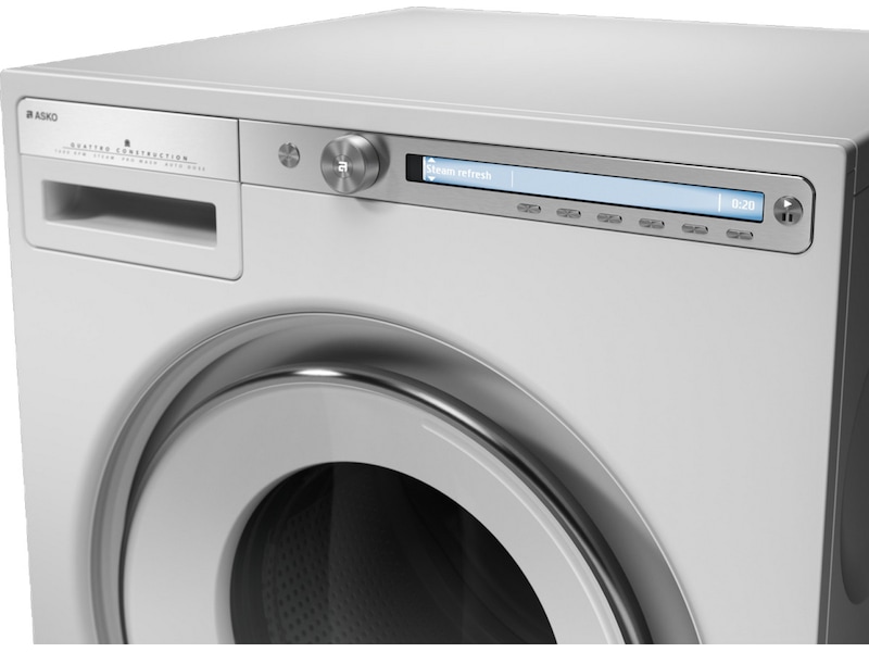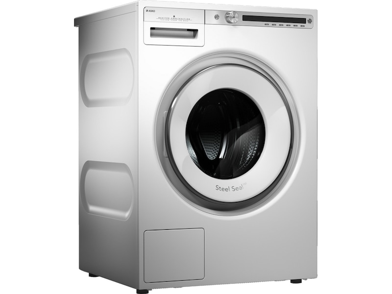 Denne hvite vaskemaskinen fra Asko's Logic-serie med detaljer i rustfritt stål har den unike Quattro Construction™ og den hygieniske Steel Seal™-døren.