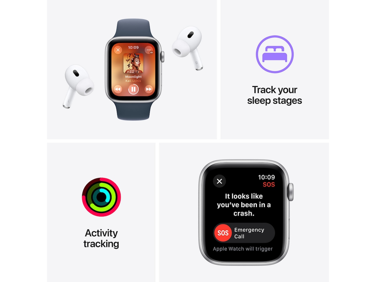 Alt det viktigste for å holde deg motivert og aktiv, ha kontakten med andre, gi deg oversikt over helsen din og være trygg. Smart stabel og redesignede apper i watchOS 10 gir deg mer informasjon ved et øyekast. Med funksjoner som Registrering av ulykke og bedre treningsmålinger gir Apple Watch SE mer valuta for pengene.