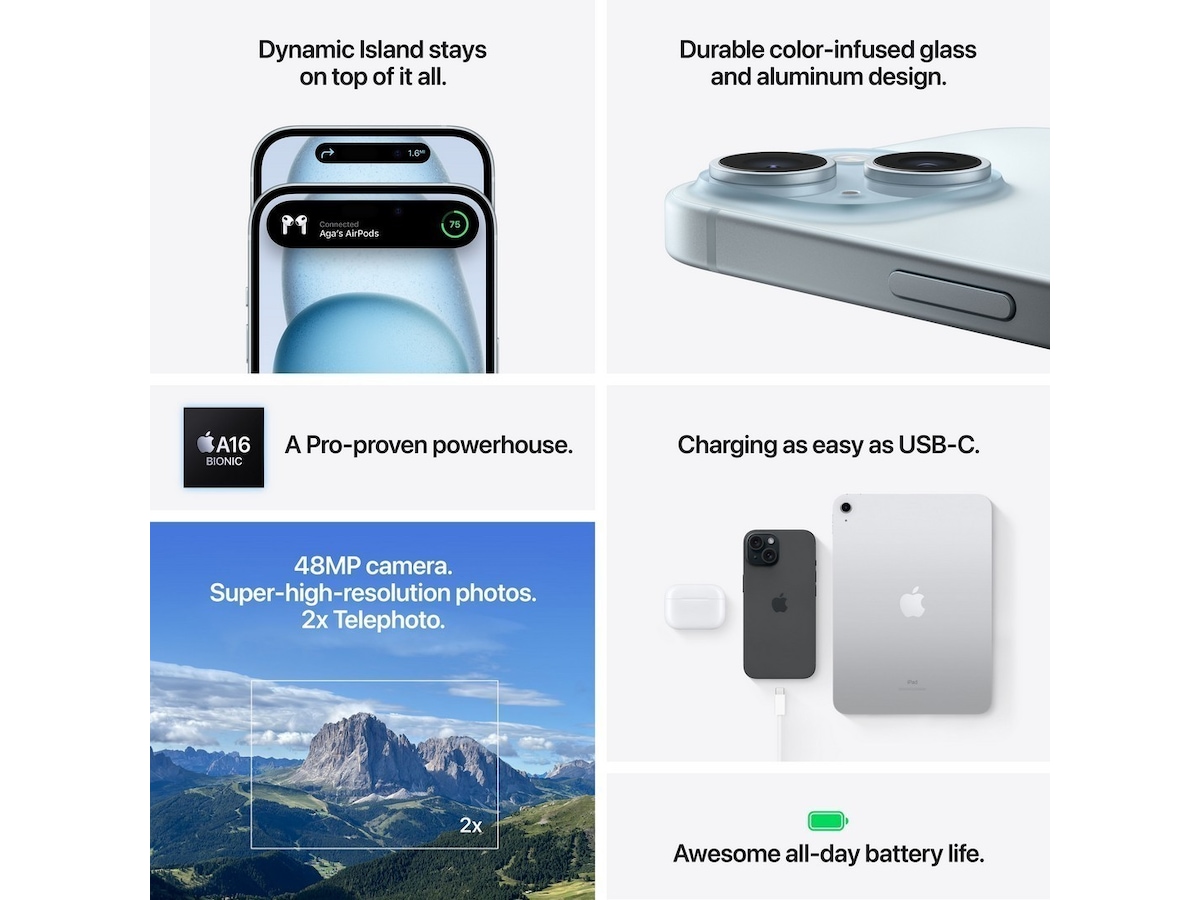 iPhone 15 Plus har en solid design av gjennomfarget glass og aluminium. Den er sprut-, vann- og støvbestandig.1 På forsiden har den Ceramic Shield, som er sterkere enn glasset på noen smarttelefon. Og Super Retina XDR-skjermen på 6,7 tommer2 er opptil dobbelt så lyssterk i solskinn sammenlignet med iPhone 14.