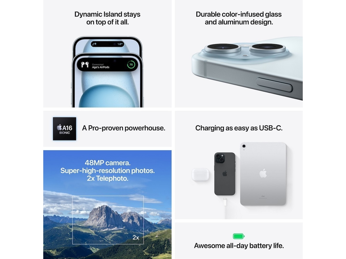 iPhone 15 har Dynamic Island, 48 MP hovedkamera og USB-C, i en solid design av gjennomfarget glass og aluminium.
